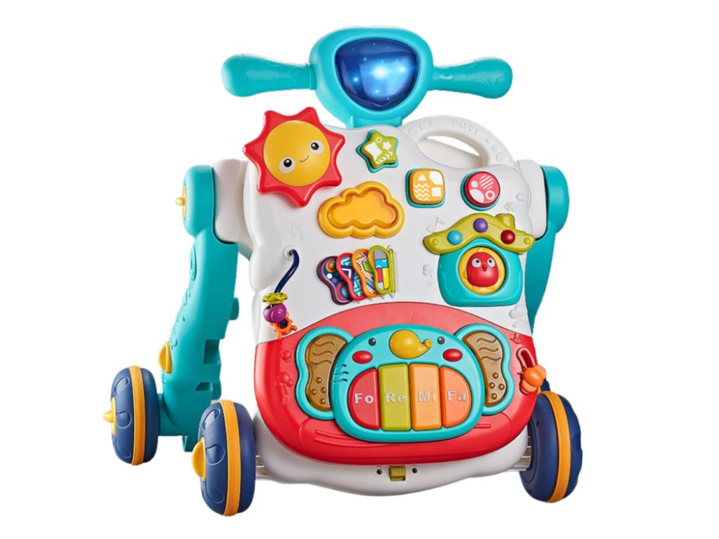 Je vybavená farebnými klávesami klavíra, otočnými prvkami, zvukovými tlačidlami a LED svetlami, ktoré stimulujú zmysly dieťaťa a podporujú rozvoj jeho motoriky. Pevné, široké kolesá zaisťujú stabilitu a nastaviteľná rýchlosť robí túto hračku bezpečnou aj pre najmenšie deti. Vďaka rôznym vzdelávacím funkciám hračka učí rozpoznávať tvary, farby, zvuky a melódie a zároveň rozvíja predstavivosť a motorickú koordináciu.