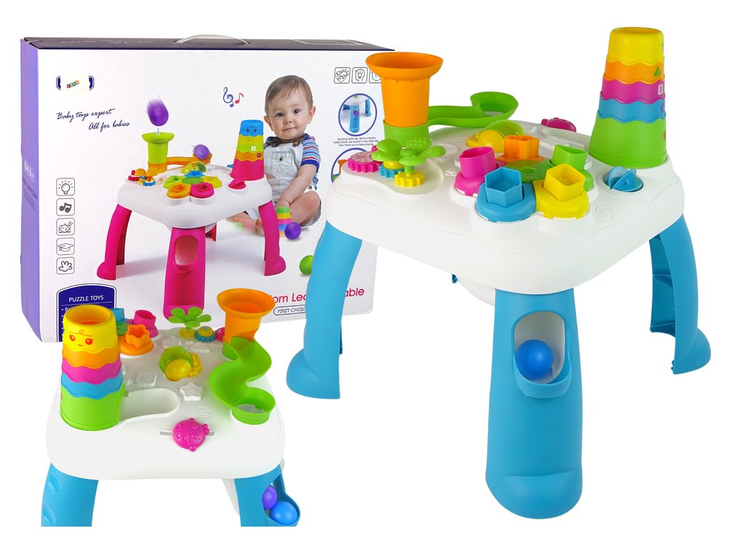 Stôl je biely a modrý, s farebnými LED diódami a rôznymi tvarmi, ktoré spríjemnia hranie. Stlačiteľné prvky určite zaujmú každé dieťa a zároveň ho naučia používať ruky na dotyk toho, čo vidí očami. Kuličková dráha určite zaujme každé batoľa, ktoré si bude užívať pohľad na kuličky, ako sa kotúľajú dole. Osvetlený triedič ho naučí rozoznávať tvary a priraďovať ich k príslušným otvorom.