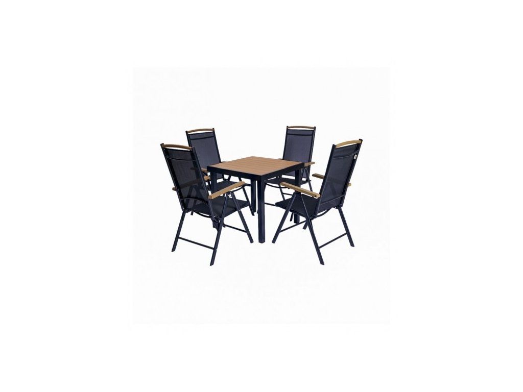 Stôl, ktorý je ústredným bodom súpravy, sa vyznačuje pevnou konštrukciou z ľahkého, ale odolného hliníka. Jeho rám zaručuje stabilitu a trvácnosť. Ďalšou vlastnosťou stola z tohto materiálu je aj jeho odolnosť proti korózii, čo sa skvele osvedčí pri vonkajšom používaní. Stoličky, ktoré sú súčasťou súpravy, sú tiež vyrobené z hliníka. Podrúčky v drevovom odtieni im dodávajú elegantný vzhľad.