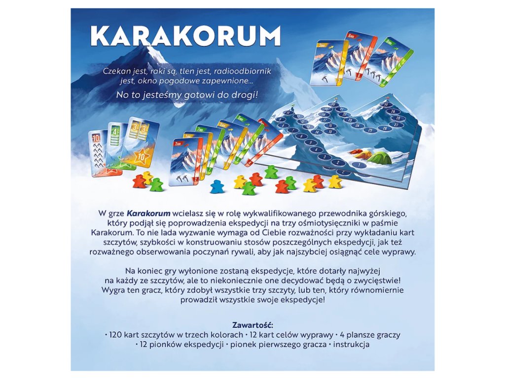 V hre Karakorum sa vžijete do úlohy kvalifikovaného horského vodcu, ktorý sa podujal viesť expedíciu na tri osemtisícovky v pohorí Karakorum. Nie je to žiadna malá výzva, ktorá vyžaduje, aby ste boli opatrní pri rozmiestňovaní kariet vrcholov, rýchli pri vytváraní stohov pre jednotlivé expedície a pozorní voči krokom svojich súperov, aby ste čo najrýchlejšie dosiahli ciele expedície.