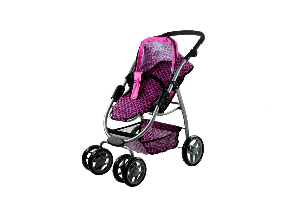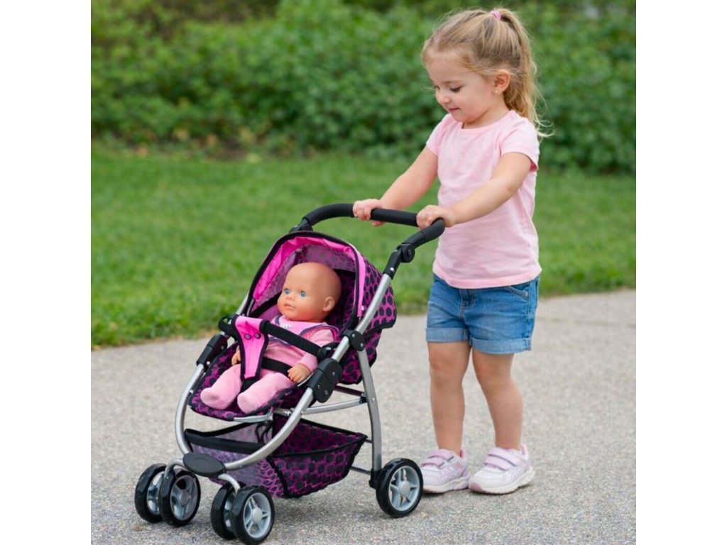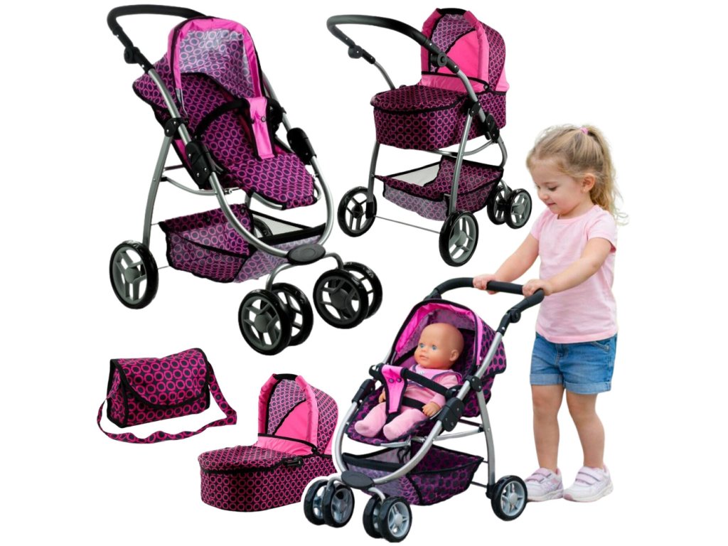 Čierny kočík s ružovými detailmi možno použiť ako športový kočík, kočík alebo klasický model s vaničkou. Zmena konfigurácie kočíka výrazne diverzifikuje hru a dievčatám ponúka mnoho spôsobov, ako sa zabaviť. Zmena variantov zahŕňa presunutie hlavného prvku kočíka, vďaka čomu vyzerá ako úplne iná hračka. Odolná a pevná konštrukcia je vyrobená zo strieborných hliníkových rúrok, ktoré fantasticky ladia s čalúnením kočíka vyrobeným z materiálu najvyššej kvality. Ružovo-čierny poťah kočíka sa vyznačuje vlastnosťami, ktoré zaručujú odolnosť a dlhú životnosť – v prípade potreby je možné odnímateľné prvky prať ručne alebo čistiť vlhkou handričkou, aby sa zachovali vysoké hygienické štandardy.