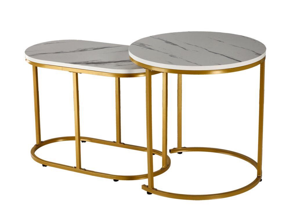 Vrchné dosky s imitáciou bieleho mramoru dodávajú stolíkom luxusný a nadčasový vzhľad, zatiaľ čo zlatý kovový rám vytvára jemný kontrast a vizuálny akcent. Vďaka svetlému prevedeniu pôsobia biele konferenčné stolíky vzdušne a opticky zväčšujú priestor, čo ich robí ideálnymi najmä do moderných a menších obývačiek.
