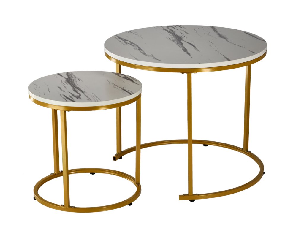 Konferenčné stolíky Paula v bielom mramorovom dizajne predstavujú elegantné a praktické riešenie pre moderný interiér. Táto dvojdielna sada okrúhlych konferenčných stolíkov spája nadčasový vzhľad mramoru s jemným luxusom zlatej kovovej konštrukcie, vďaka čomu sa stáva výrazným, no stále harmonickým prvkom priestoru.