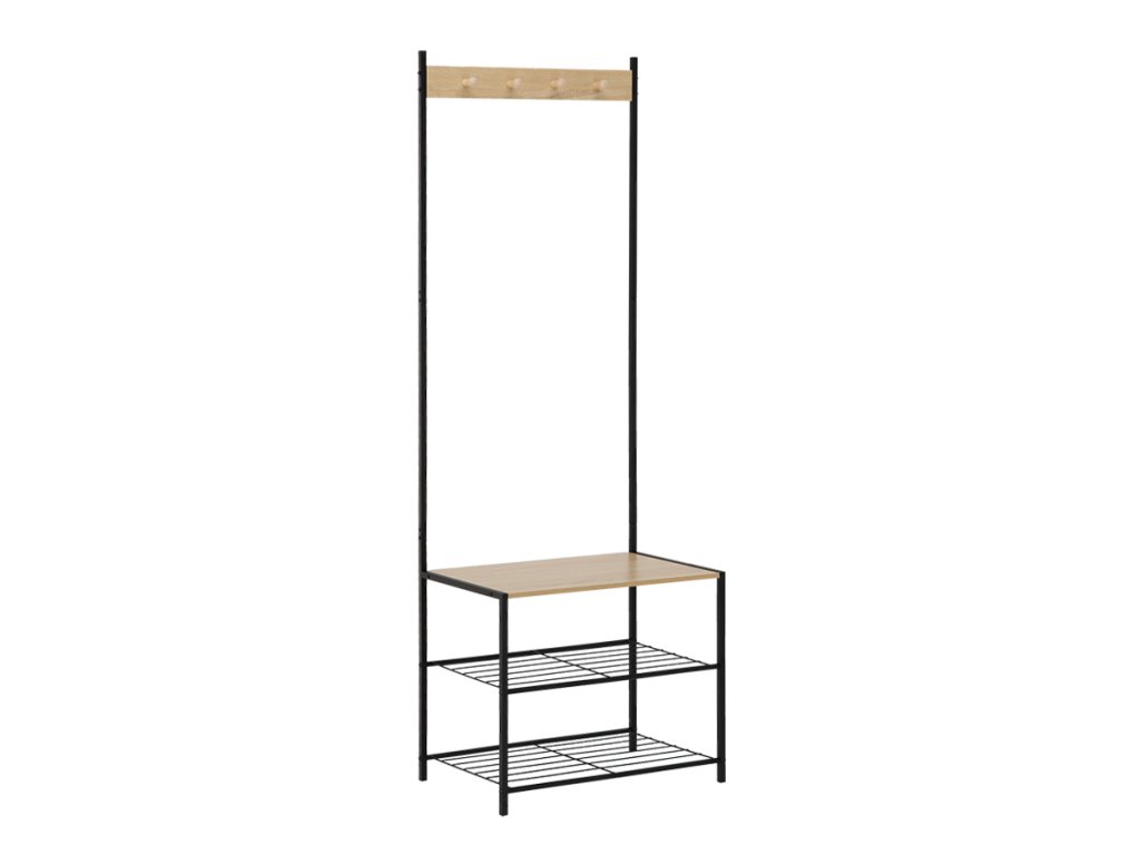 Jeho loftový dizajn sa vyznačuje čistými líniami, kovovou konštrukciou a univerzálnym čiernym prevedením, vďaka čomu zapadne do industriálnych, moderných aj minimalistických interiérov. Pevný kovový rám zaručuje stabilitu a dlhú životnosť, pričom tri priestranné police a štyri háčiky poskytujú praktický priestor na každodenné používanie.