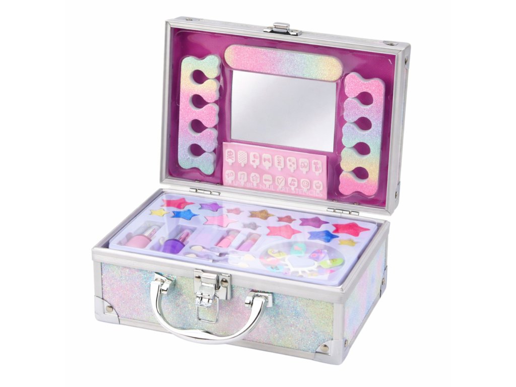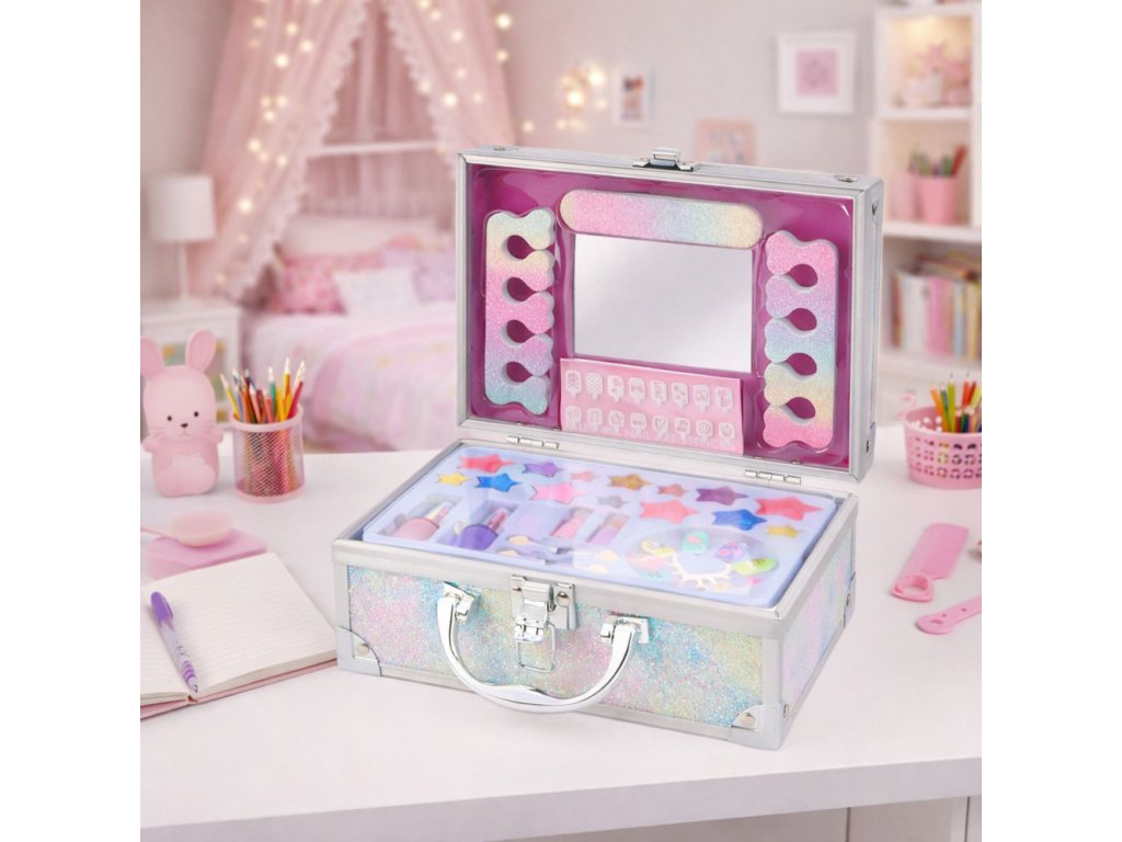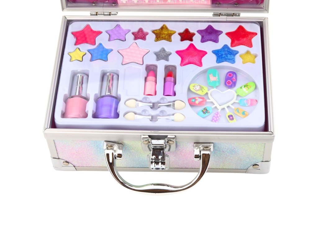 Vnútro kufríka obsahuje bohatú sadu kozmetiky na líčenie a doplnkov na styling nechtov. Deti si môžu nalakovať nechty, naniesť rúž a očné tiene a vytvoriť si vlastný štýl. Priložené zrkadielko uľahčuje hru a dodáva celému kufríku vzhľad skutočného kozmetického kufríka.
