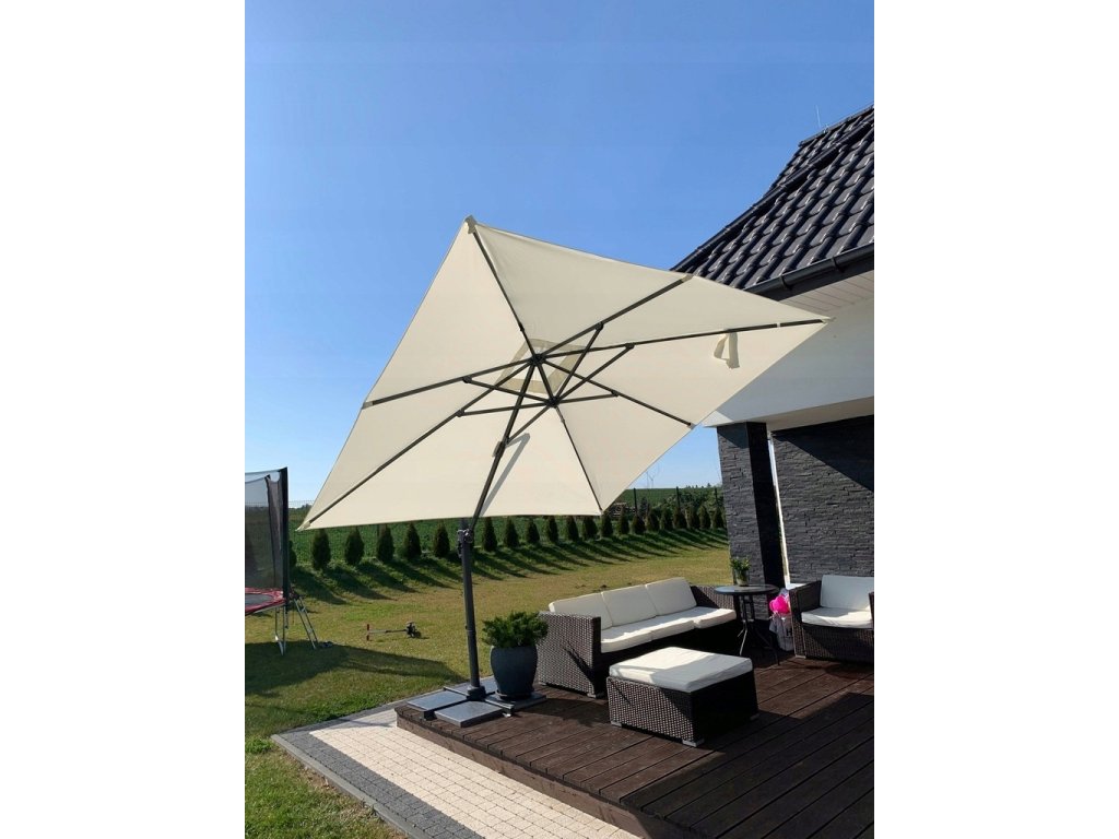 Krémový záhradný slnečník Roma s rozmerom 3 × 3 m predstavuje ideálne riešenie pre každého, kto hľadá spoľahlivé tienenie, moderný dizajn a maximálnu flexibilitu používania. Elegantná krémová farba pôsobí jemne, čisto a ľahko sa kombinuje s akýmkoľvek záhradným nábytkom či terasovým vybavením. Veľká štvorcová strieška vytvára rozsiahlu tieniacu plochu, ktorá ochráni pred ostrým slnkom, UV žiarením aj miernym dažďom.