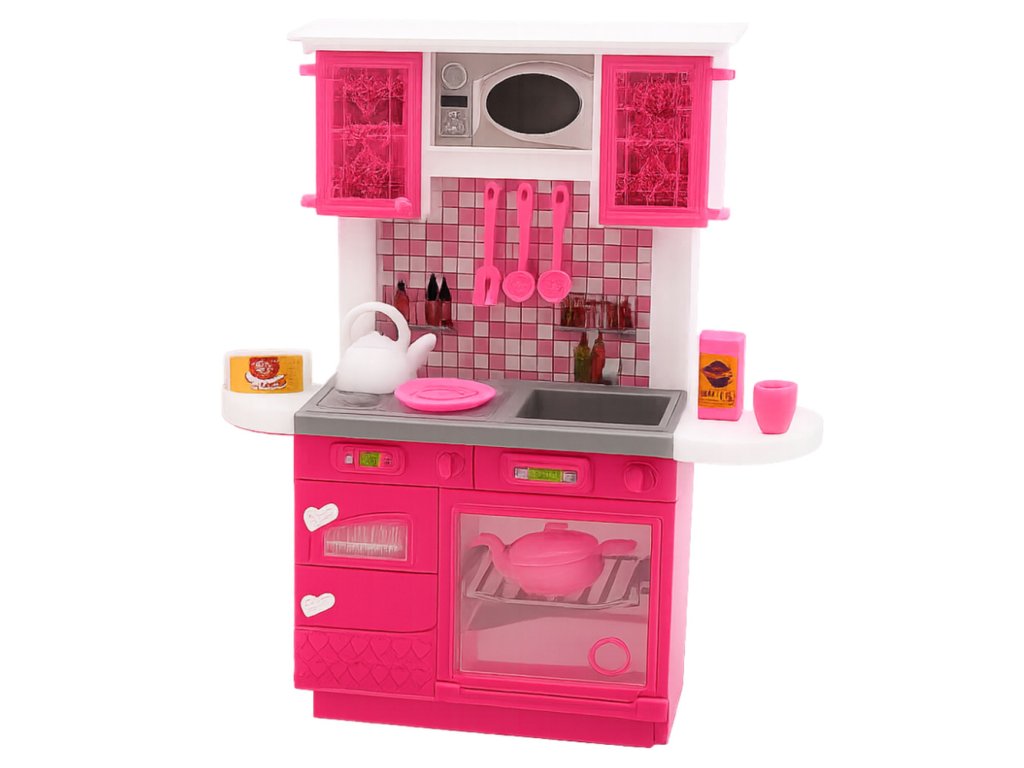 Súprava obsahuje aj vysokú chladničku s otváracími dvierkami, do ktorej môžete uložiť priložené potravinové doplnky. Bohatá sada riadu a potravín vám umožňuje vytvoriť mnoho scén súvisiacich s varením, pečením, prestieraním stola alebo upratovaním kuchyne. Celá sada je vyhotovená v charakteristickej ružovo-bielej farebnej kombinácii, čo jej dodáva moderný a atraktívny vzhľad.