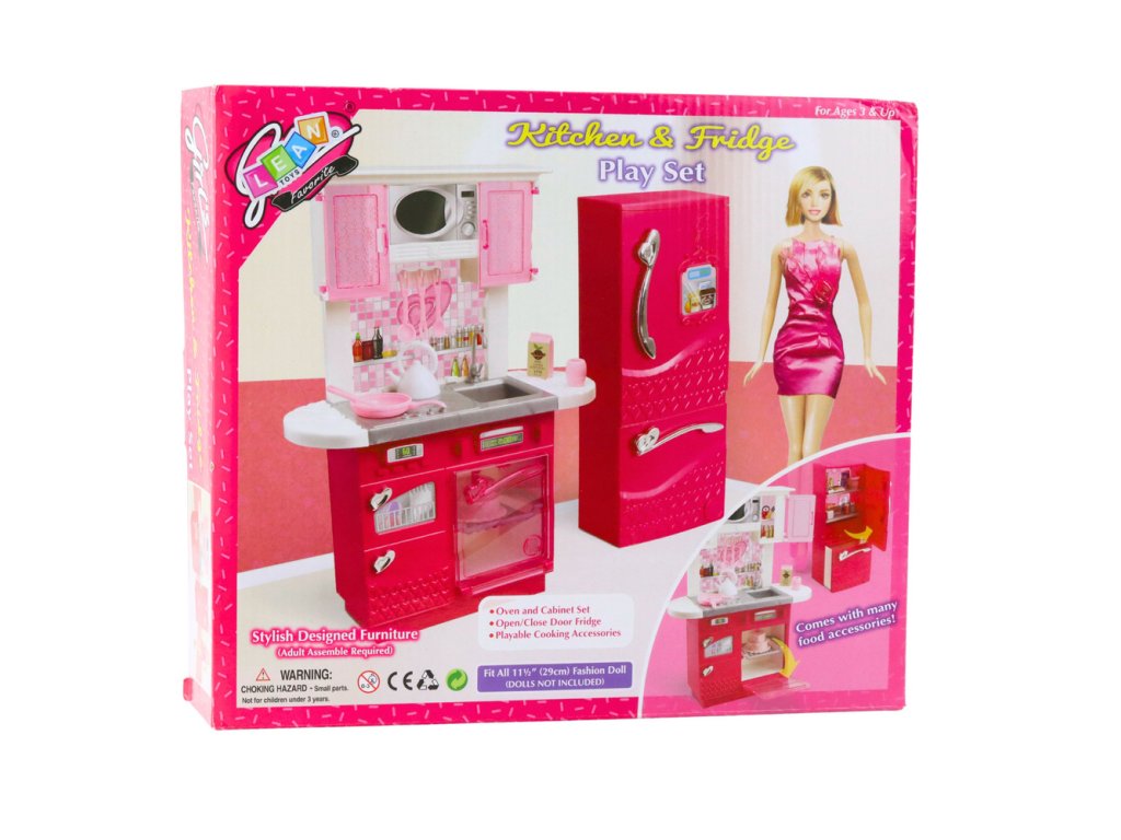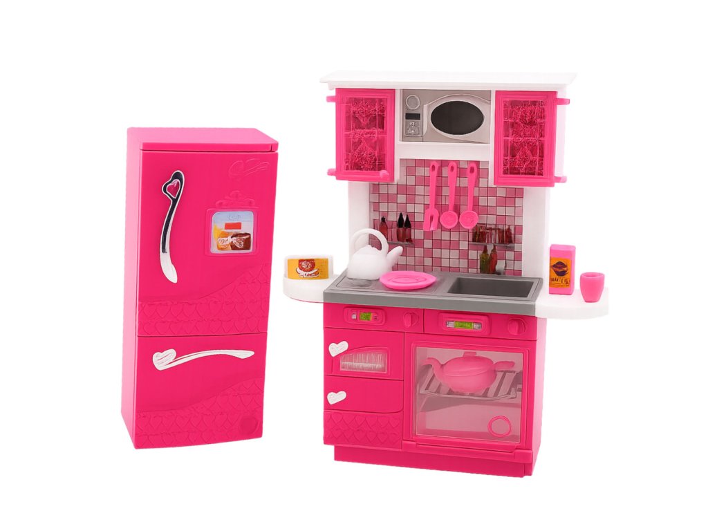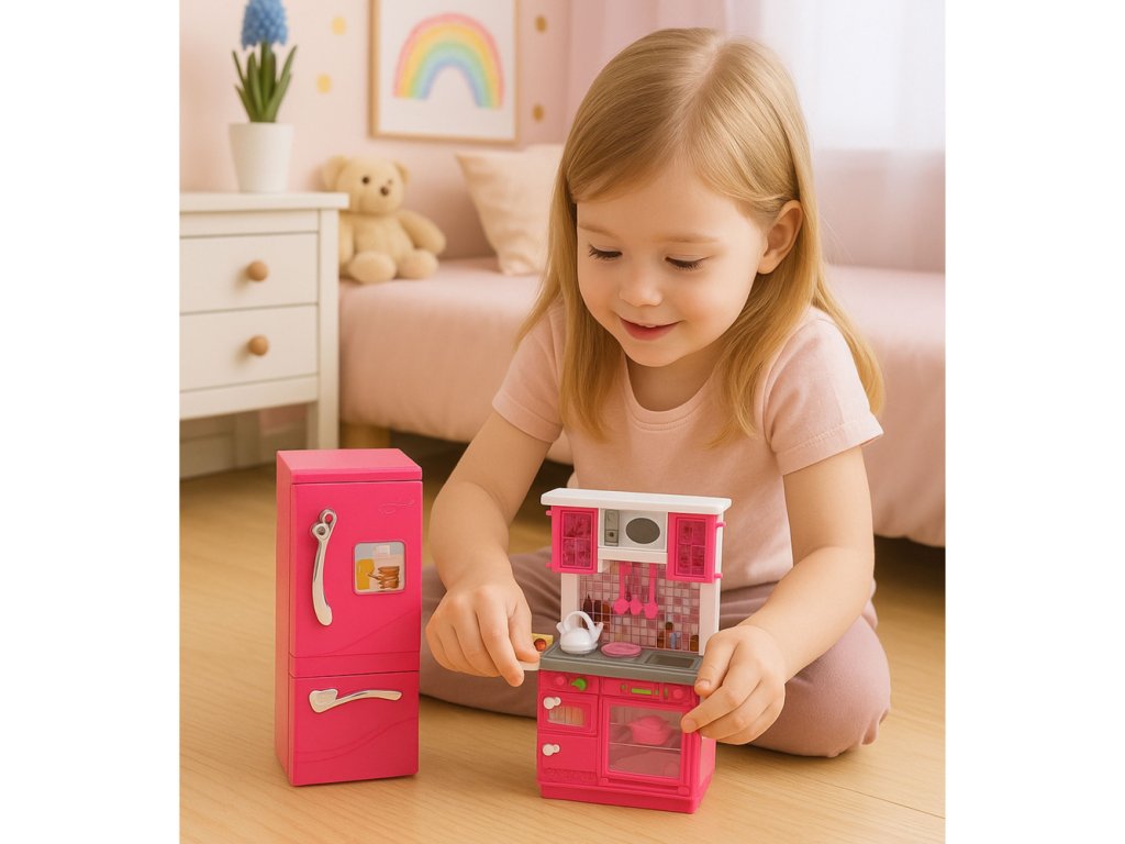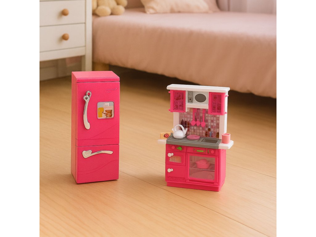 Súprava kuchyne a chladničky je dokonale replikovaná súprava kuchynského nábytku určená pre módne bábiky vysoké približne 29 cm. Súprava vám umožňuje hrať rôzne kulinárske scény, pripravovať jedlá a organizovať kuchynské činnosti. Centrálnym prvkom sady je kuchynská linka s otvárateľnou rúrou, skrinkami a drezom. Každý prvok je navrhnutý tak, aby vyzeral realisticky a bol funkčný, čo podporuje kreatívnu hru.