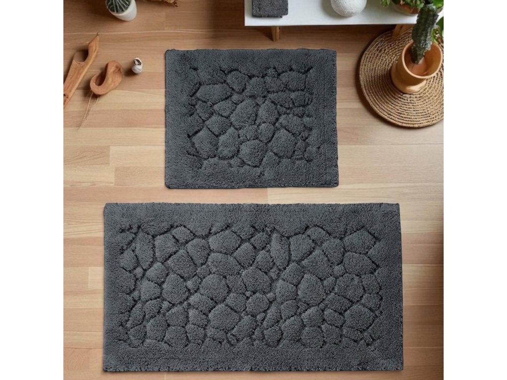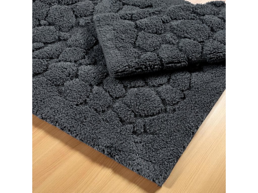 Spodná strana koberčekov je opatrená protišmykovou úpravou, ktorá zvyšuje bezpečnosť a zabraňuje neželanému posúvaniu na mokrej podlahe. Moderný 3D reliéfny vzor pripomínajúci okruhliaky pridáva do kúpeľne jemný vizuálny akcent a podčiarkuje elegantný dizajn setu.