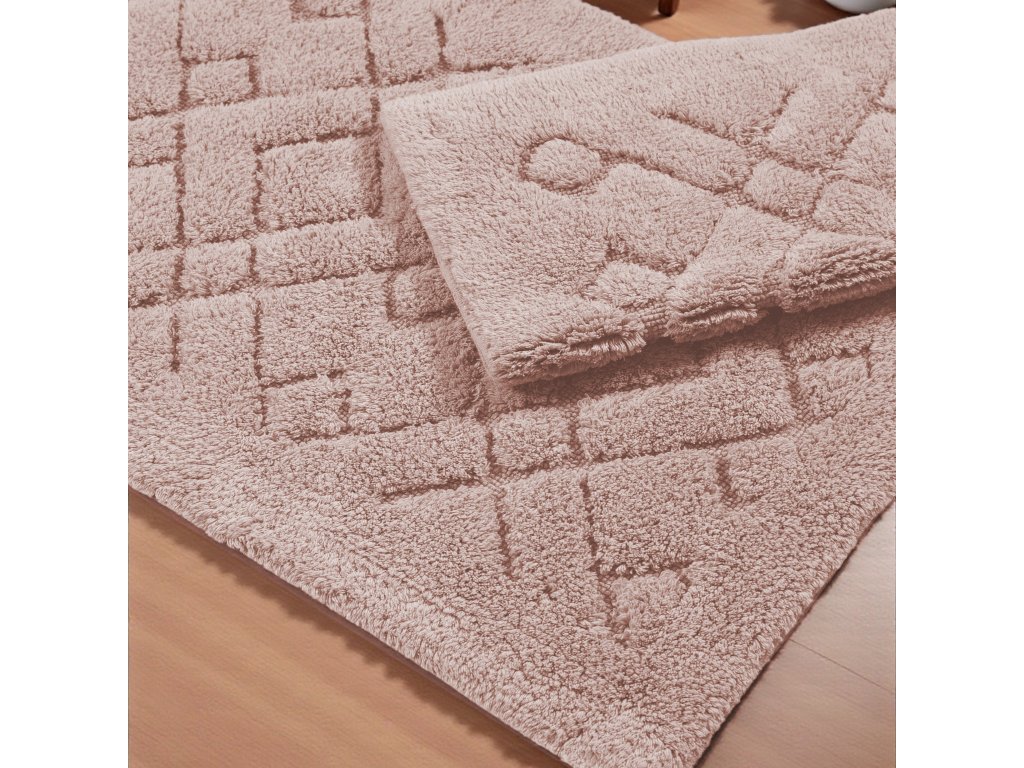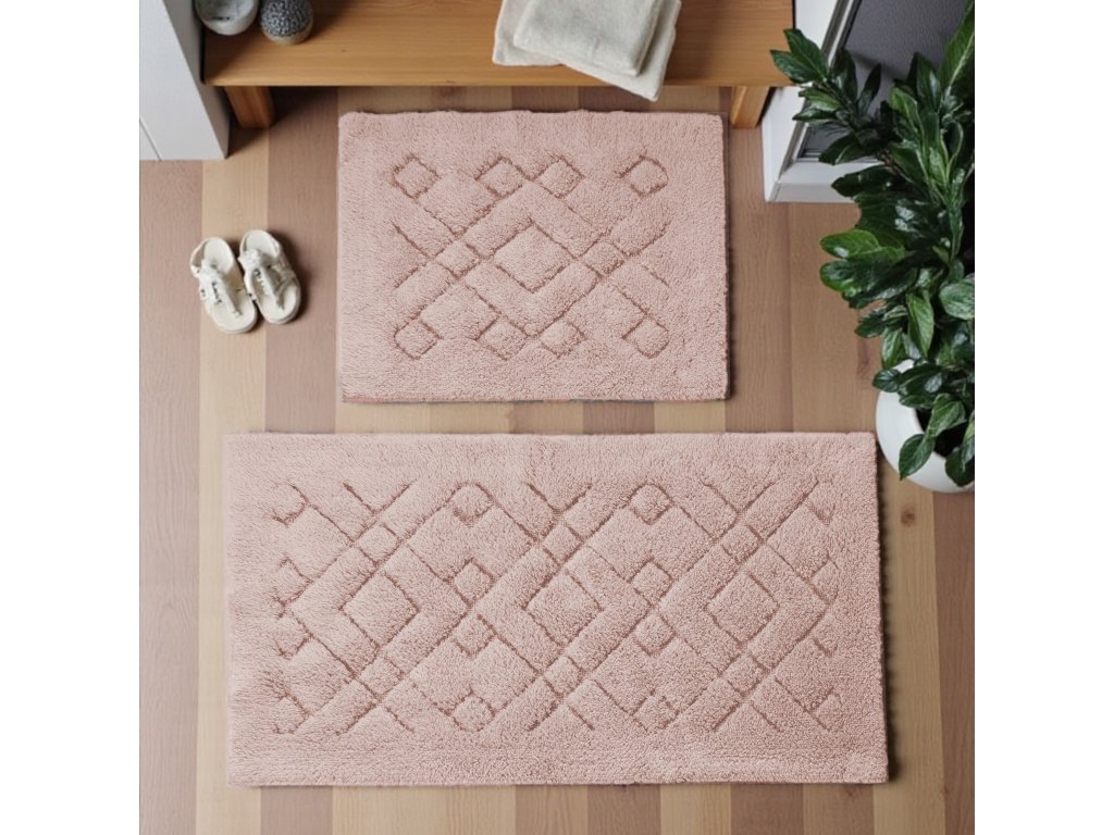 Oživte svoju kúpeľňu jemným luxusom s kúpeľňovou sadou koberčekov Boston 12 v púdrovo ružovej farbe. Tento dvojdielny set kombinuje štýlový geometrický kosoštvorcový vzor s vysokým komfortom, čím dodáva kúpeľni moderný a útulný charakter. Ružový odtieň pôsobí nežne a harmonicky, ideálny do klasických aj moderných priestorov, kde pridáva jemný nádych elegancie.