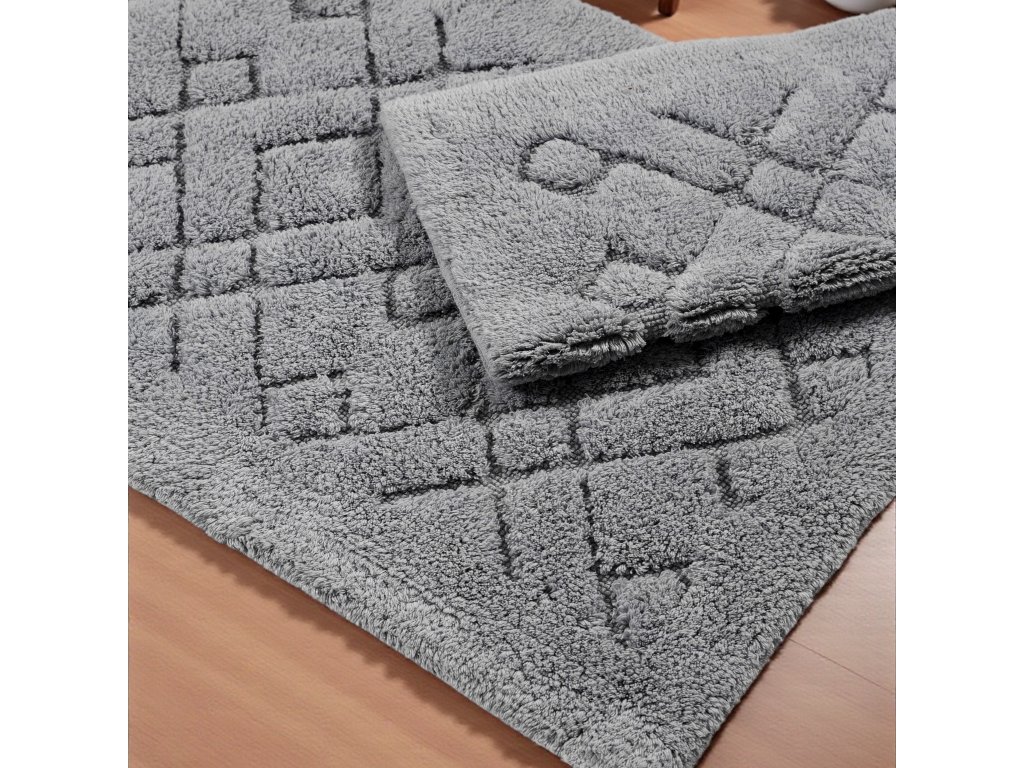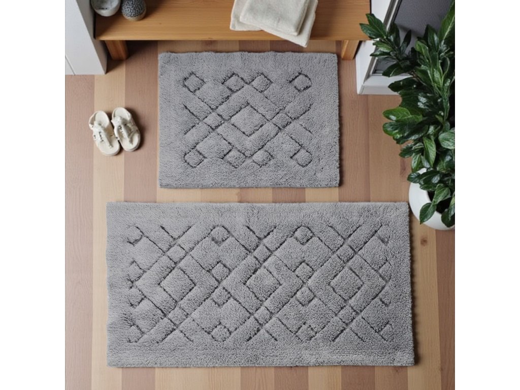 Doprajte svojej kúpeľni nadčasový a praktický vzhľad s kúpeľňovou sadou koberčekov Boston 12 v sivej farbe. Tento dvojdielny set s geometrickým kosoštvorcovým vzorom kombinuje moderný dizajn s komfortom, pričom dodáva priestoru harmonický a uprataný dojem. Sivý odtieň je neutrálny a elegantný, čo umožňuje jeho jednoduché kombinovanie s rôznymi štýlmi interiéru – od minimalistických po klasické kúpeľne.