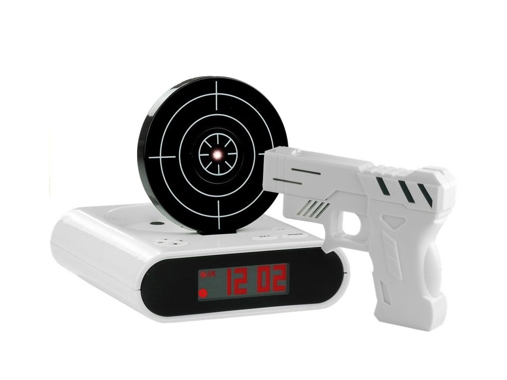 terčom Tento moderný budík v podobe sniperky prebudí aj tých najtvrdších spáčov. Vypnúť ho nie je také jednoduché, ako by sa mohlo zdať — pištoľ s červeným lúčom musíte rýchlym pohybom ruky namieriť na terč. Táto sada bude tiež senzačným gadgetom pre všetkých fanúšikov inovatívnych riešení. Neobmedzujme úlohu budíka len na uľahčenie nášho života — môže byť aj neobvyklou dekoráciou do akejkoľvek miestnosti alebo spálne.