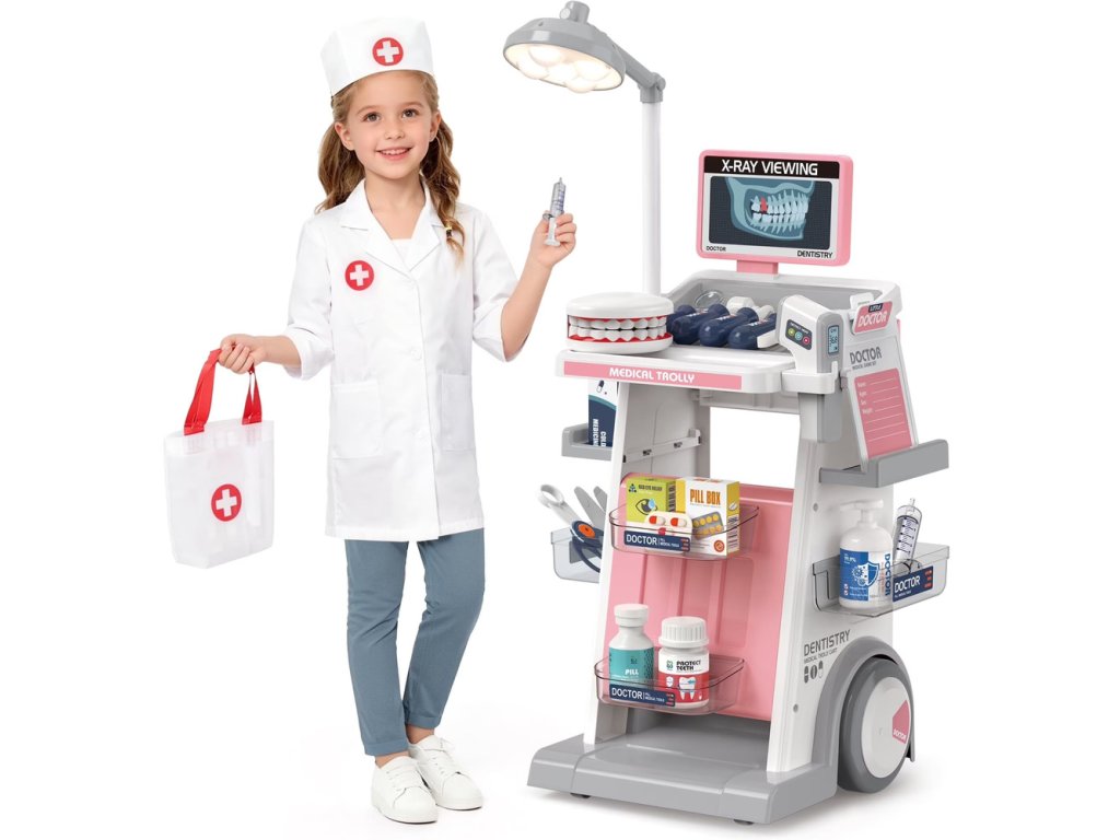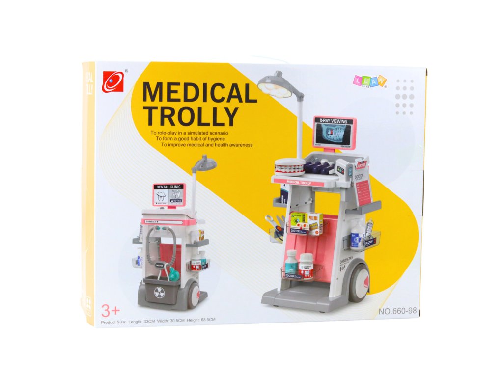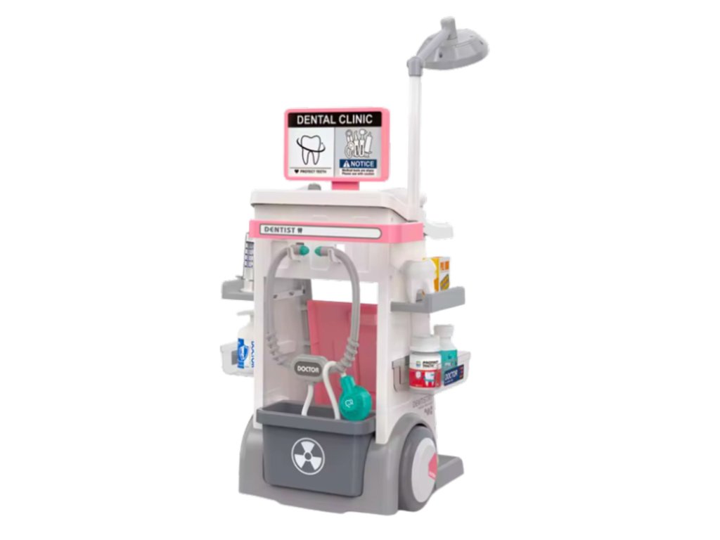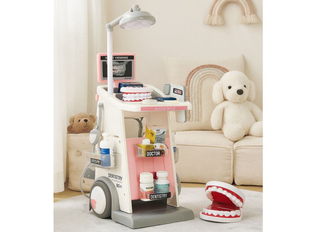 Súprava pre zubára je rozsiahly lekársky vozík, ktorý deťom umožňuje hrať sa na zubára realistickým a vzdelávacím spôsobom. Vozík bol starostlivo navrhnutý tak, aby pojmul všetky nástroje a príslušenstvo potrebné na hranie sa na zubára a zároveň poskytoval dieťaťu ľahký prístup ku každému predmetu. Produkt ponúka širokú škálu vybavenia, vrátane liečebnej lampy, obrazovky na prezeranie röntgenových snímok, otvárateľnej čeľuste so zubami a širokej škály zubných a lekárskych nástrojov, ktoré deťom umožňujú napodobňovať skutočné zubné procedúry. Interaktívne funkcie, ako je svetlo v teplomere a bezodrazová lampa, zvyšujú realizmus hry a povzbudzujú deti k tvorivosti, pričom do hry vnášajú vzdelávací prvok.