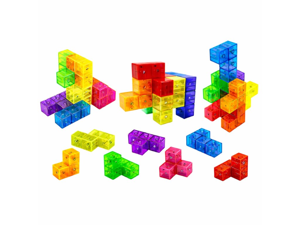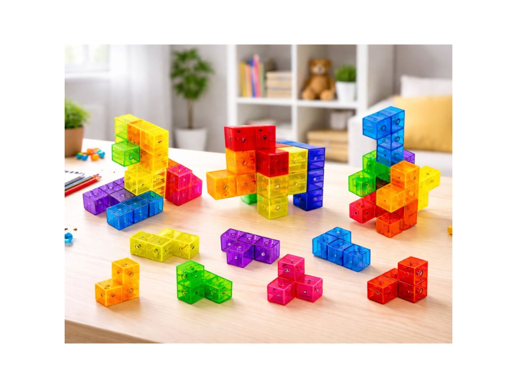 Priehľadné, farebné prvky sú pevne vyrobené a odolné a vstavané magnety zabezpečujú stabilné spojenie konštrukcií. S pomocou týchto kociek môžu deti vytvárať dvojrozmerné aj trojrozmerné modely, čím rozvíjajú svoju fantáziu a manuálne zručnosti.