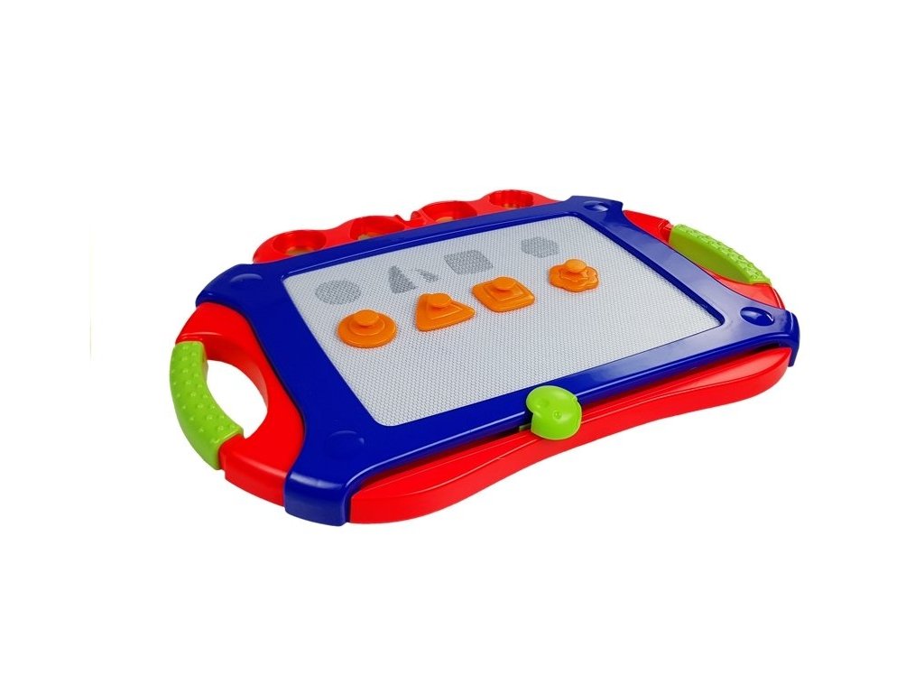 Predstavovaná sada sa skladá z dosky impozantnej veľkosti, stylusu a štyroch pečiatok v tvare geometrických útvarov. Veľká magnetická tabuľa má neutrálnu, príjemnú farebnú schému – klasické farby oslovia dievčatá aj chlapcov. Po bokoch sú rukoväte, ktoré uľahčujú prenášanie hračky.
