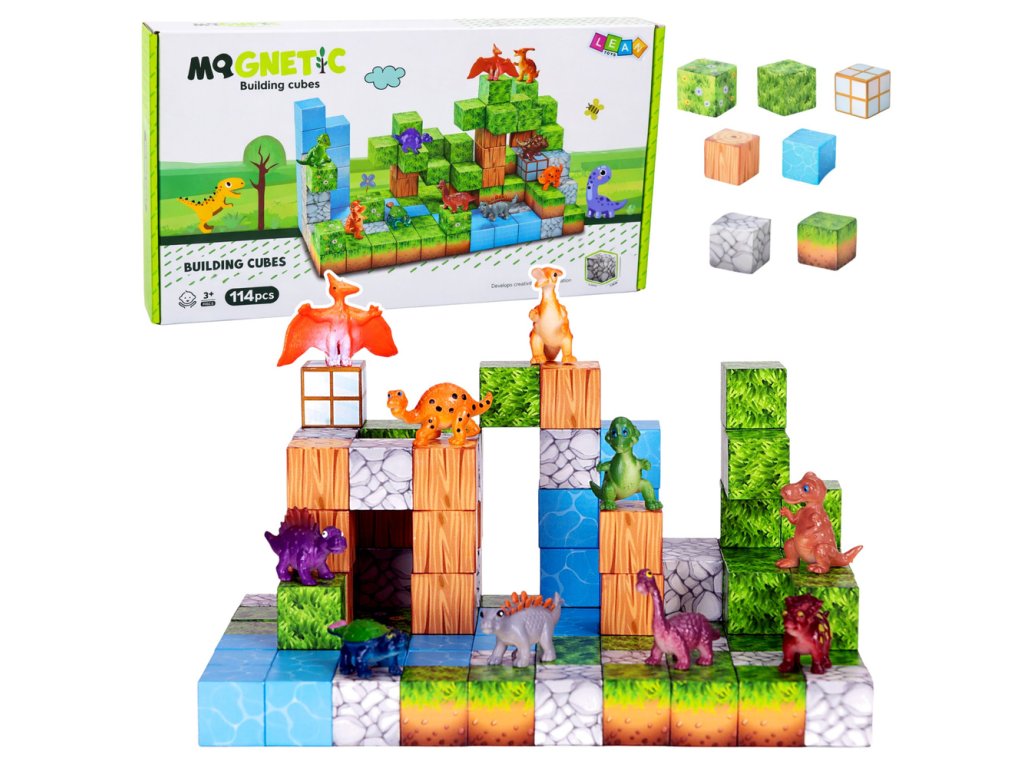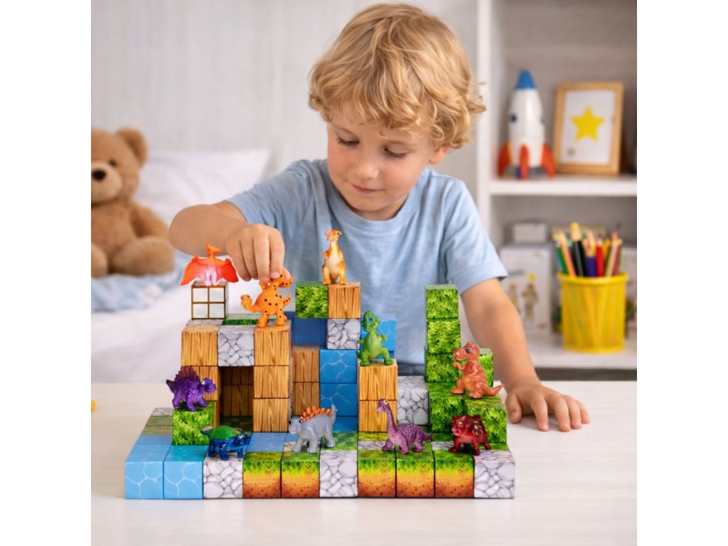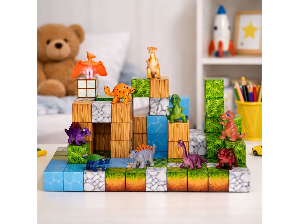 Jednotný tvar kociek a vstavané magnety umožňujú rýchle a stabilné spájanie prvkov, vďaka čomu je jednoduché stavať stromy, kopce, vodopády alebo celé scény inšpirované svetom prírody a dinosaurov. Hranie sa s kockami umožňuje deťom experimentovať, plánovať a vytvárať čoraz pokročilejšie stavby.