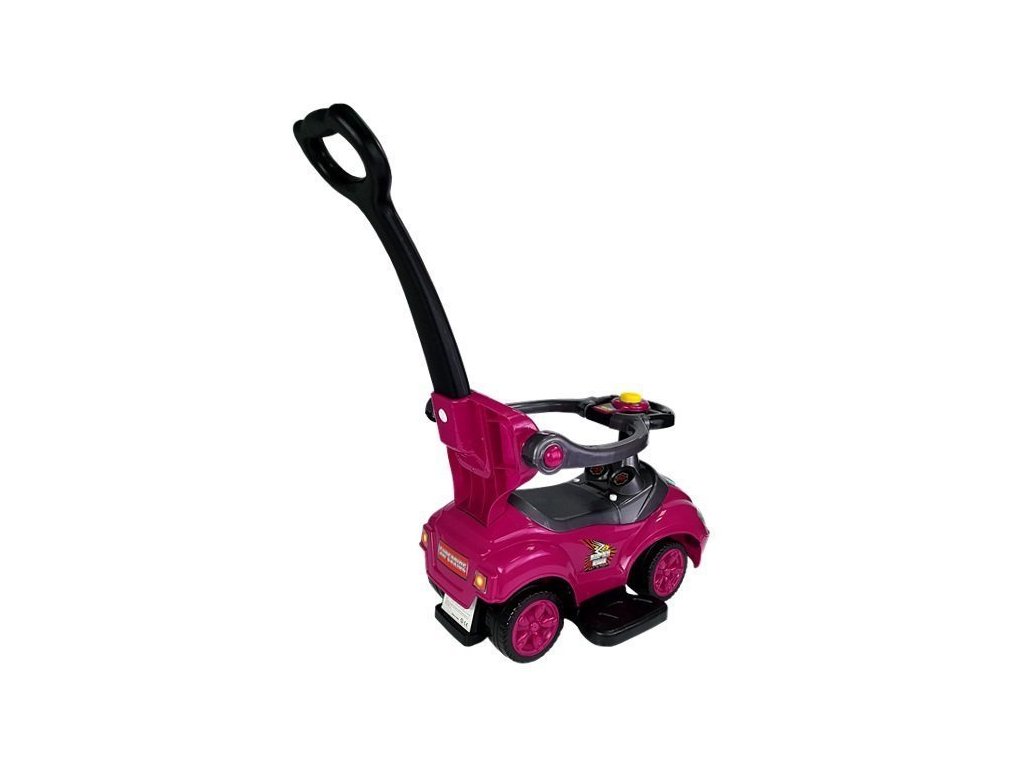 Súprava sa skladá z plastovej karosérie, tlačnej tyče, opierok na nohy, bezpečnostných tyčí, kolies, otočného volantu, operadla, zadnej opory, nápravy a ozdobných krytov kolies. Veľkou výhodou auta je, že sa dá ľahko premeniť z tlačnej hračky na jazdeckú hračku – stačí odstrániť stúpadlá, bezpečnostné tyče a tlačnú tyč a vaše dieťa ho môže riadiť samo. Sedadlo hračky sa dá zdvihnúť – priestor pod ním môžete využiť na uloženie obľúbených hračiek vášho dieťaťa alebo napríklad na prezlečenie. Tlačidlo uprostred volantu je pískacie.