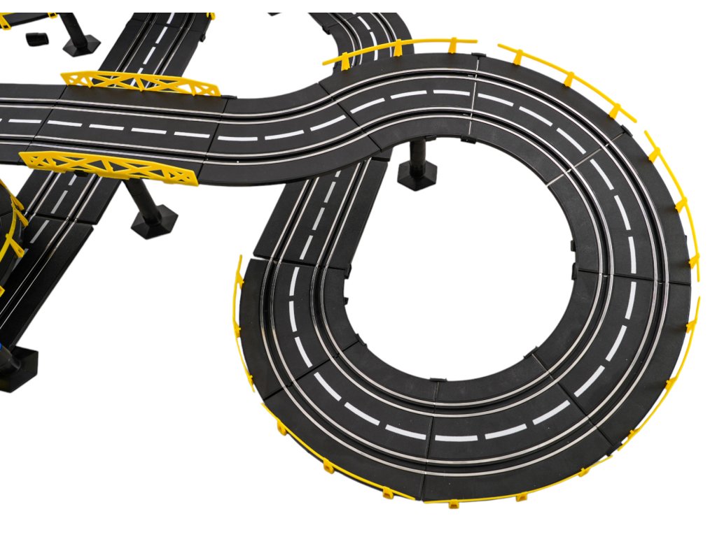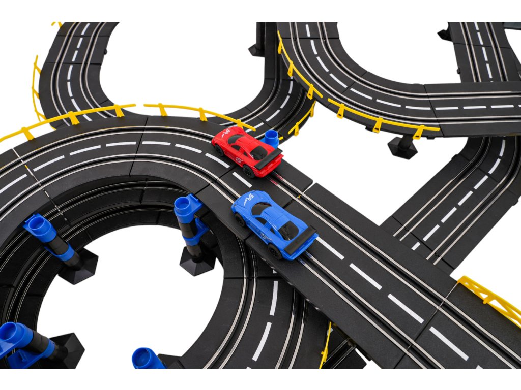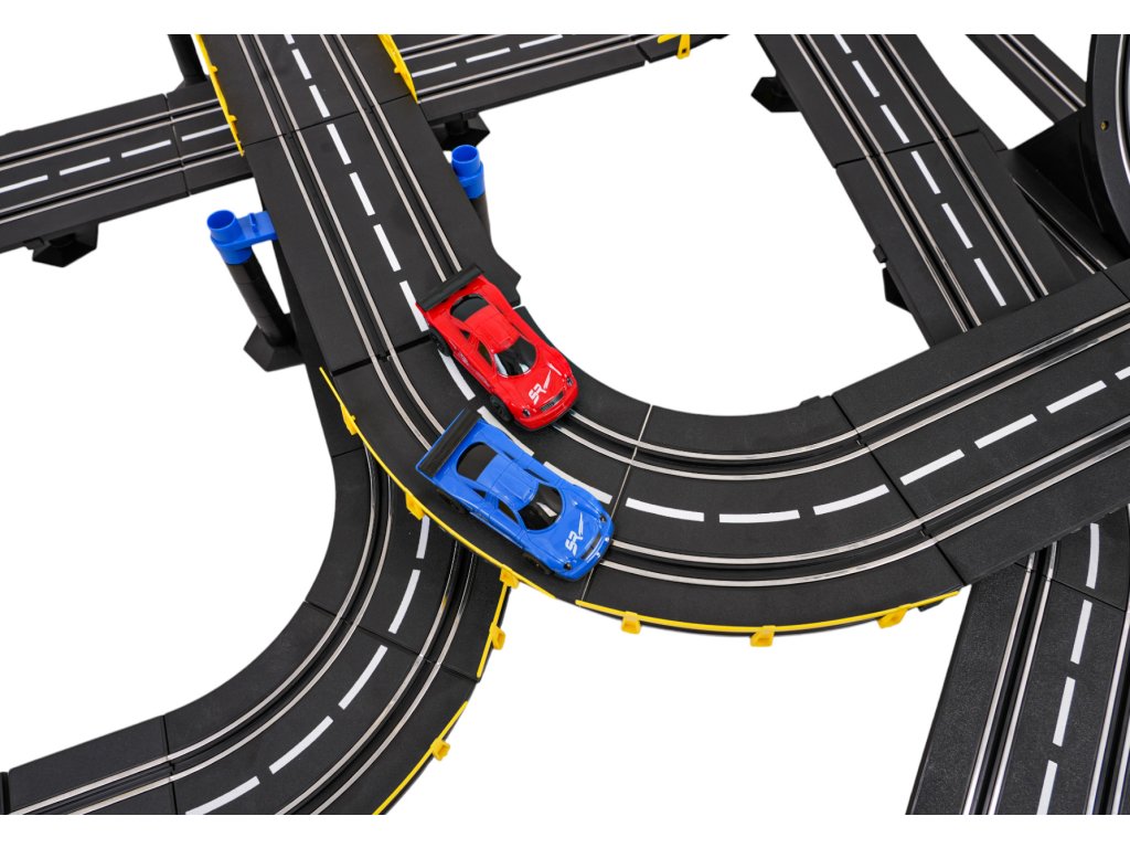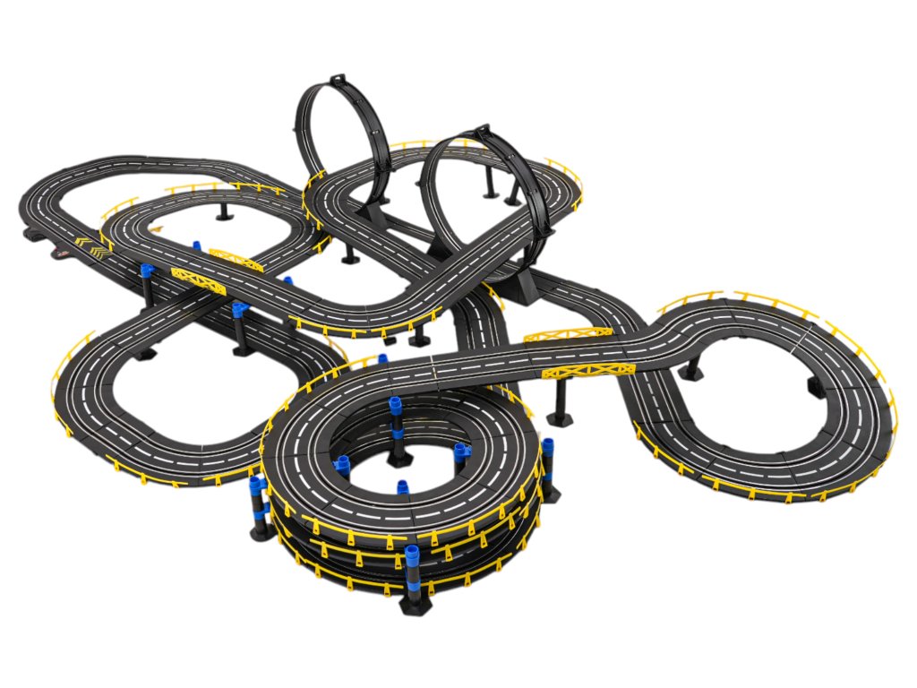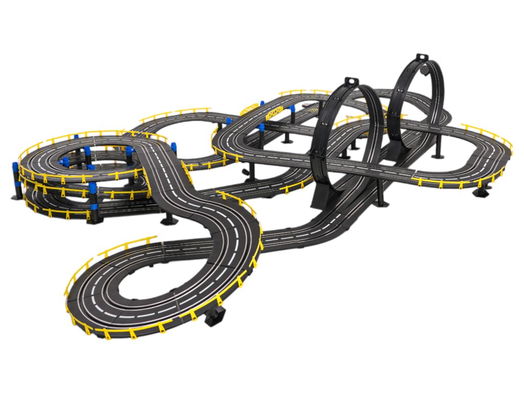 Veľká závodná dráha v mierke 1:43 s dvoma diaľkovo ovládanými autami pre deti od 3 rokov. Jednotlivé konštrukčné prvky umožňujú postaviť dráhu s ostrými zákrutami, špirálami a rovnými úsekmi, aby bola hra čo najatraktívnejšia a celý zážitok ešte vzrušujúcejší. Táto jedinečná sada je perfektnou hračkou pre malých nadšencov motoristického športu. Trať má počítadlo kôl. Je napájaná elektrickou energiou 220 V – 50 Hz. |