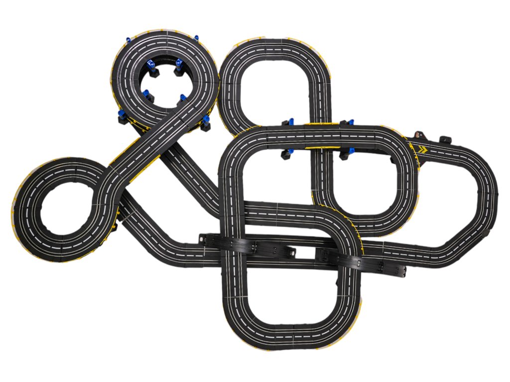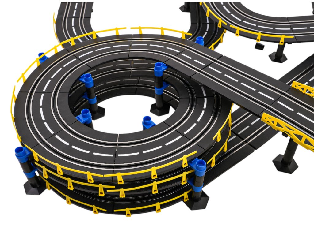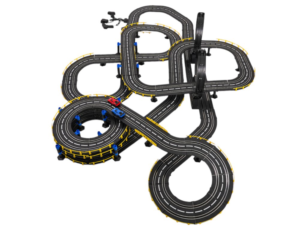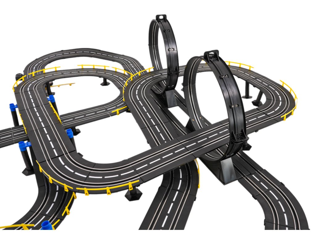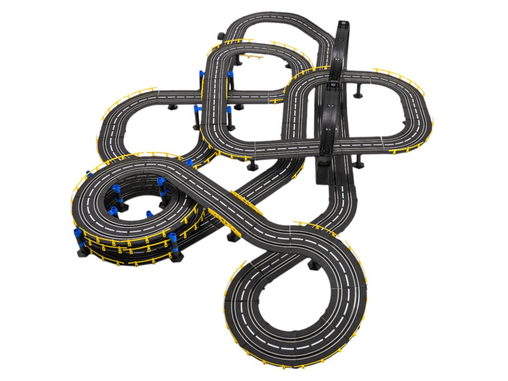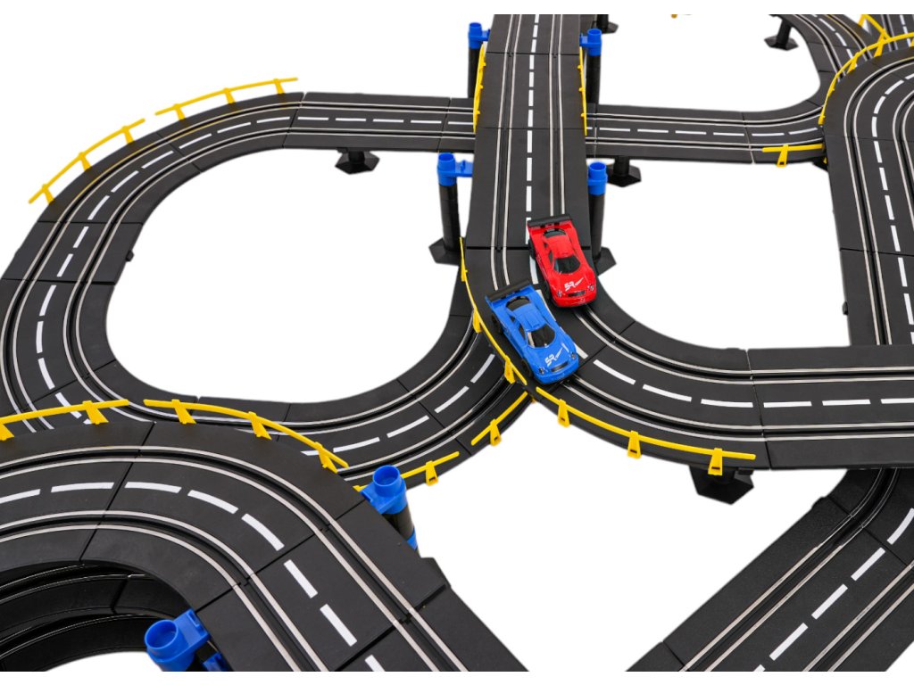 Veľká závodná dráha v mierke 1:43 s dvoma diaľkovo ovládanými autami pre deti od 3 rokov. Jednotlivé konštrukčné prvky umožňujú postaviť dráhu s ostrými zákrutami, špirálami a rovnými úsekmi, aby bola hra čo najatraktívnejšia a celý zážitok ešte vzrušujúcejší. Táto jedinečná sada je perfektnou hračkou pre malých nadšencov motoristického športu. Trať má počítadlo kôl. Je napájaná elektrickou energiou 220 V – 50 Hz. |