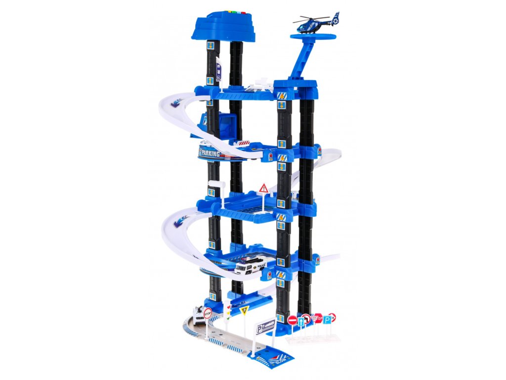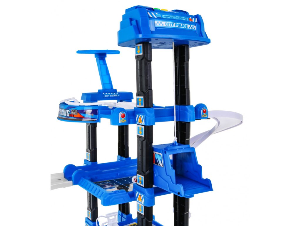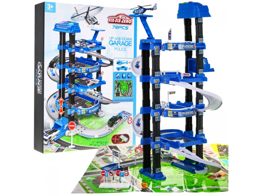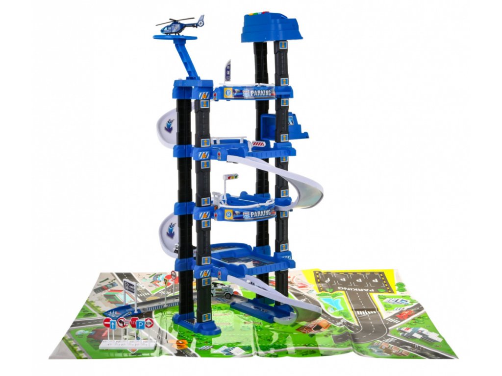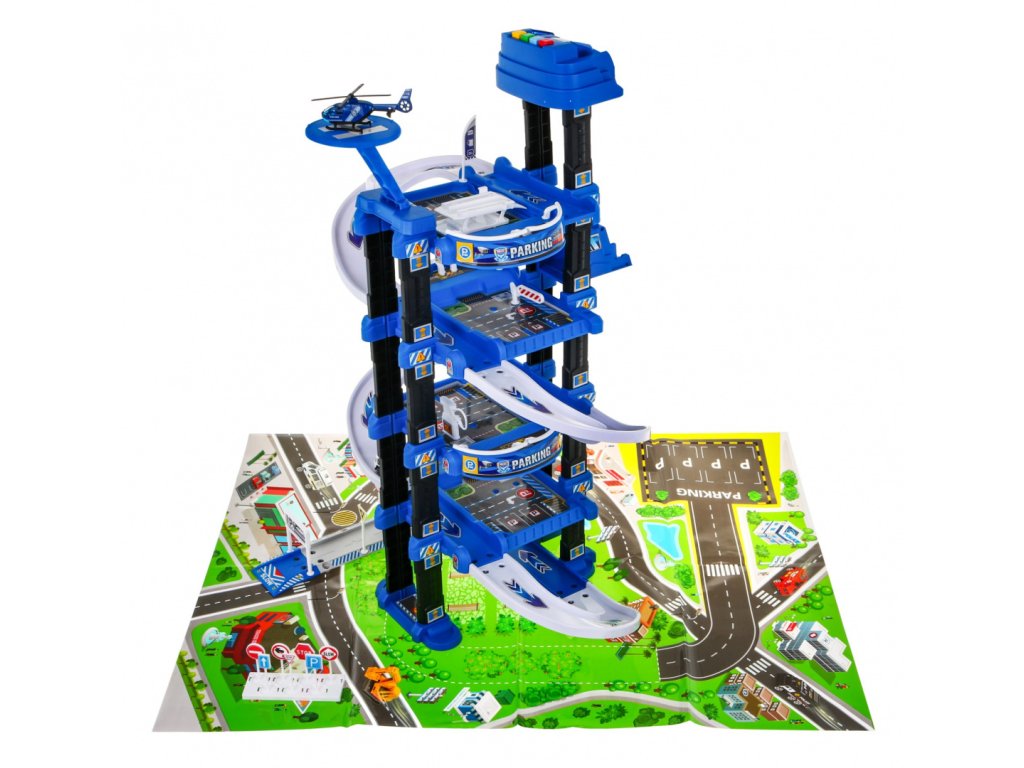 | | Toto veľké viacúrovňové policajné parkovisko je určené pre deti od 3 rokov. Parkovisko sa skladá z piatich úrovní, na ktoré sa dá dostať výťahom alebo šmýkačkou. Na ceste z úrovne na úroveň vaše dieťa narazí na mnoho atrakcií. Na nižšej úrovni je dráha, po ktorej sa môžu pohybovať vozidlá, a vyššie na ďalších úrovniach sú parkovacie miesta pre vozidlá. Na samom vrchole sa nachádza pristávacia plocha pre vrtuľníky a výťah s blikajúcimi svetlami a zvukmi, ktorý jazdí hore a dole. Súprava obsahuje dve vozidlá, vrtuľník, dopravné značky a podložku s ulicami a budovami pre parkovisko. Hračka je napájaná 3 batériami AA 1,5 V, ktoré sú súčasťou súpravy. |
