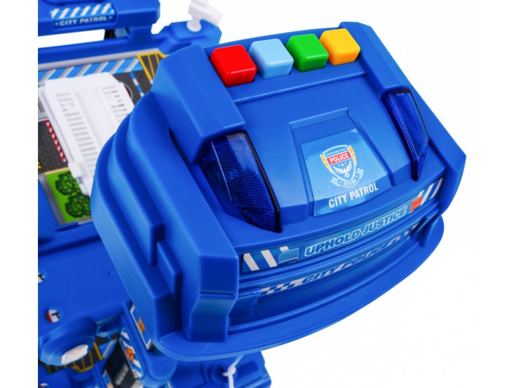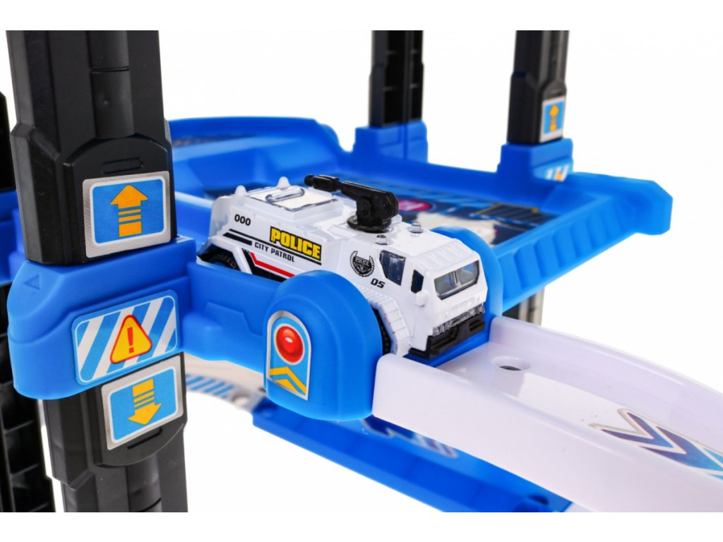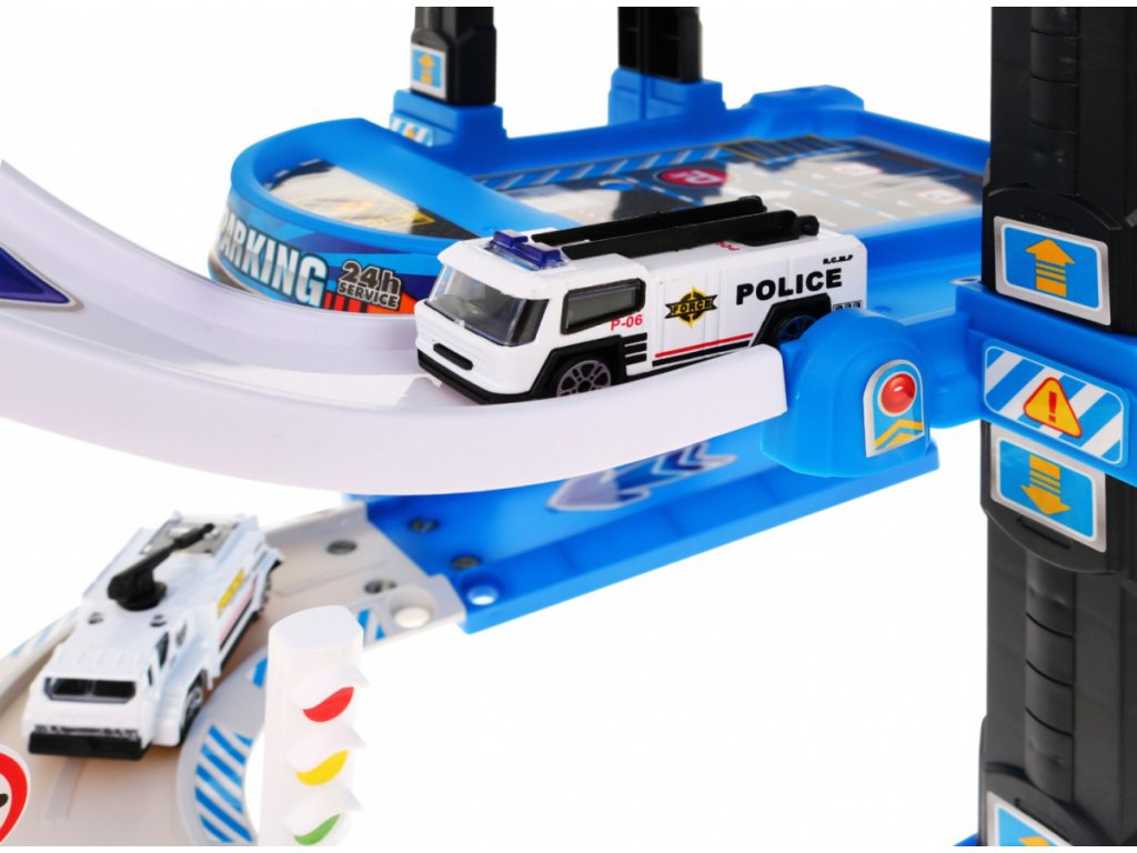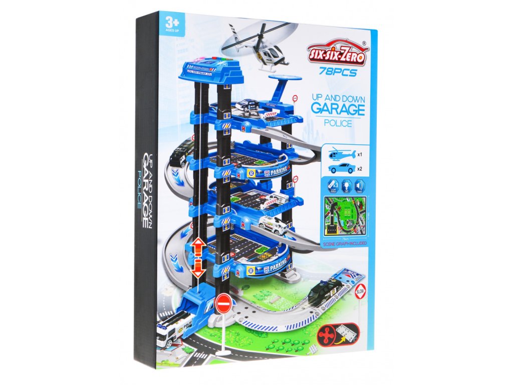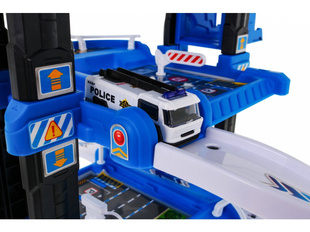 | | Toto veľké viacúrovňové policajné parkovisko je určené pre deti od 3 rokov. Parkovisko sa skladá z piatich úrovní, na ktoré sa dá dostať výťahom alebo šmýkačkou. Na ceste z úrovne na úroveň vaše dieťa narazí na mnoho atrakcií. Na nižšej úrovni je dráha, po ktorej sa môžu pohybovať vozidlá, a vyššie na ďalších úrovniach sú parkovacie miesta pre vozidlá. Na samom vrchole sa nachádza pristávacia plocha pre vrtuľníky a výťah s blikajúcimi svetlami a zvukmi, ktorý jazdí hore a dole. Súprava obsahuje dve vozidlá, vrtuľník, dopravné značky a podložku s ulicami a budovami pre parkovisko. Hračka je napájaná 3 batériami AA 1,5 V, ktoré sú súčasťou súpravy. |