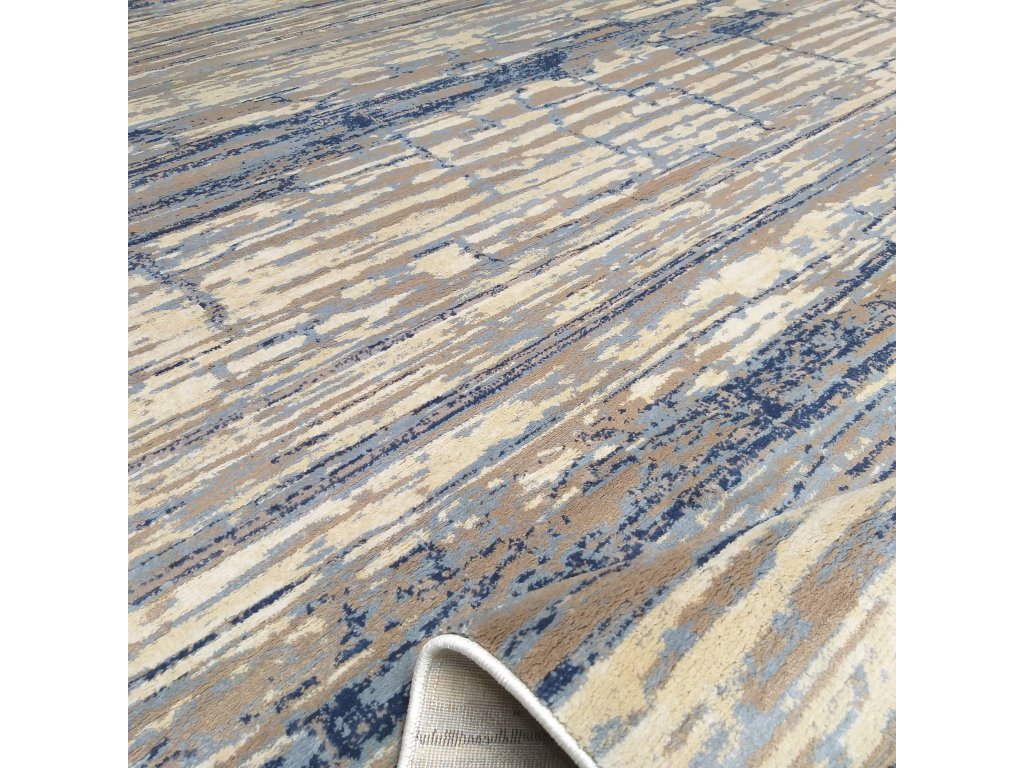Moderný béžový koberec s abstraktným vzorom Milas PRI 15A-CB vnáša do interiéru nádych moderného umenia a nadčasovej elegancie. Jeho dizajn je postavený na jemných horizontálnych líniách v béžových a krémových tónoch, ktoré sú dynamicky doplnené o výrazné modré akcenty. Abstraktný motív pripomína prírodné textúry a hru svetla a tieňa, vďaka čomu pôsobí prirodzene, moderne a harmonicky.
