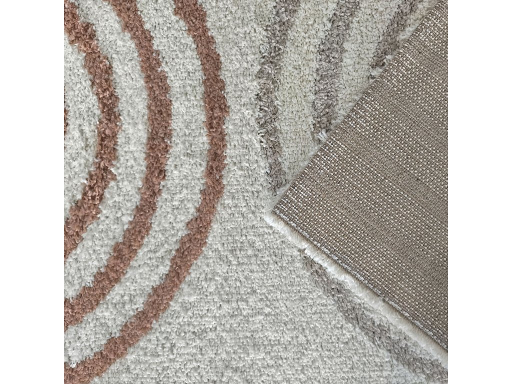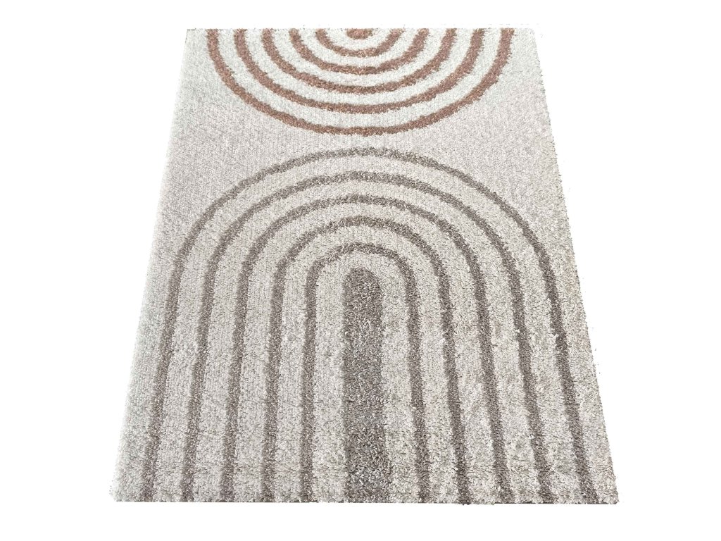 Moderný béžový shaggy koberec Santo 03 je ideálnou voľbou pre interiéry, v ktorých má dominovať pohodlie a nadčasový dizajn. Geometrický vzor s jemnými oblúkovými líniami pôsobí elegantne a zároveň zjemňuje celkový vzhľad miestnosti. Neutrálne béžové a hnedé tóny sa ľahko kombinujú s rôznymi štýlmi zariadenia.
