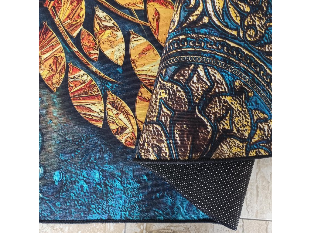 Modrý koberec Horeca-New s orientálnym vzorom „stromu života“ prináša do interiéru svieži, luxusný a štýlový akcent. Kombinácia sýtej modrej s jemnými zlatými a oranžovými detailmi vytvára harmonický a elegantný vzhľad, ktorý okamžite oživí každý priestor.