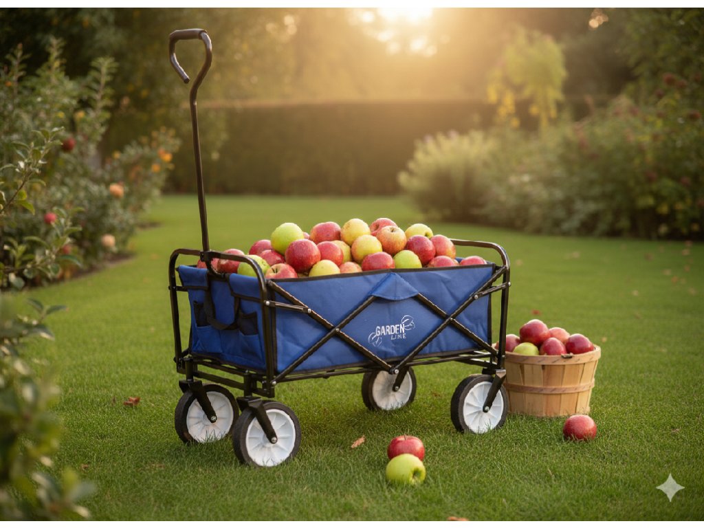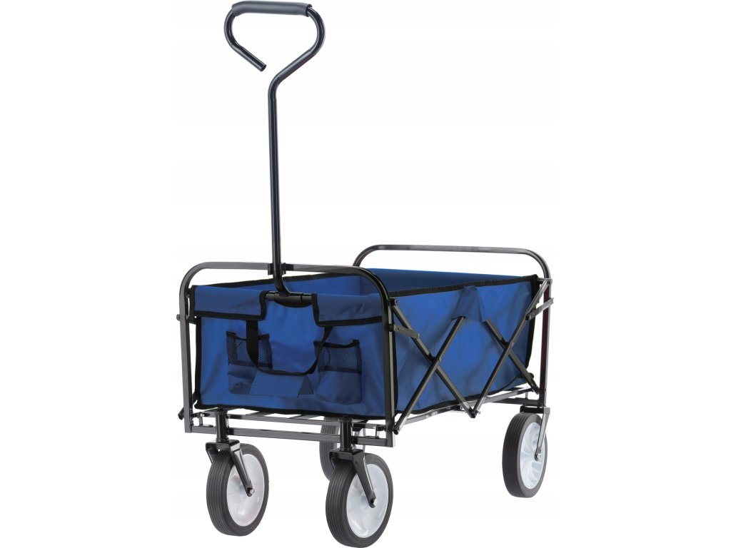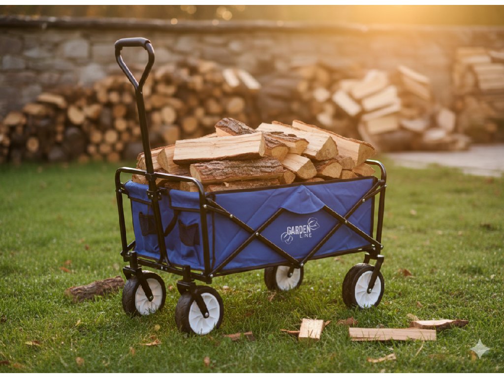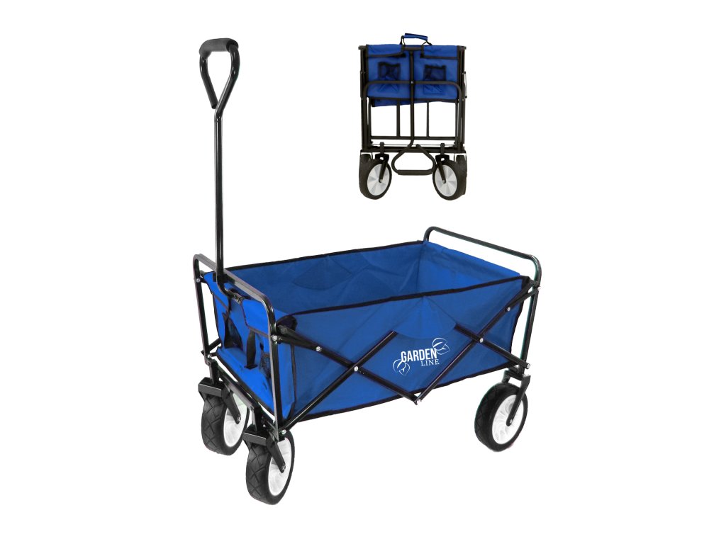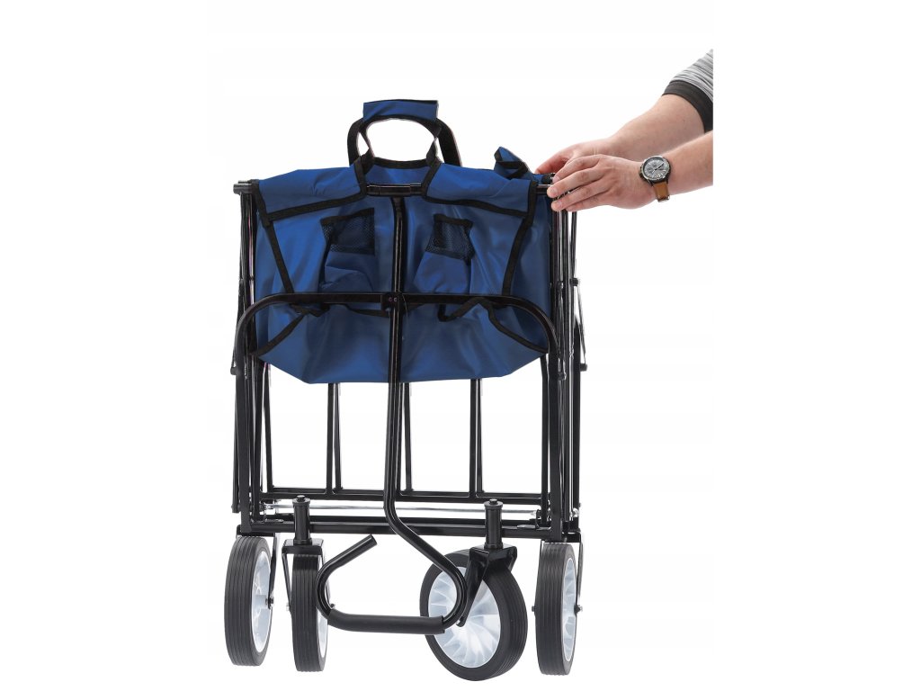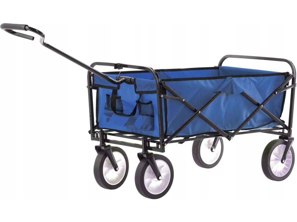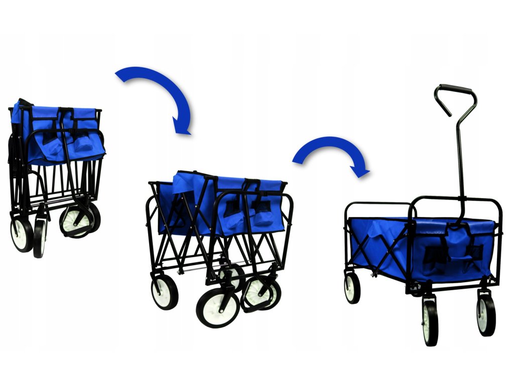 Vozík je vybavený otočnými kolieskami s rozsahom 360°, ktoré zaručujú jednoduché manévrovanie na tráve, dlažbe aj nerovnom teréne. Široká rukoväť zabezpečuje pohodlné uchopenie a lepšiu kontrolu pri ťahaní. Veľkou výhodou je rýchly skladací mechanizmus, vďaka ktorému vozík zložíte v priebehu niekoľkých sekúnd a bez použitia náradia. Po zložení zaberá minimum miesta, takže ho jednoducho uskladníte v garáži, pivnici alebo kufri auta.