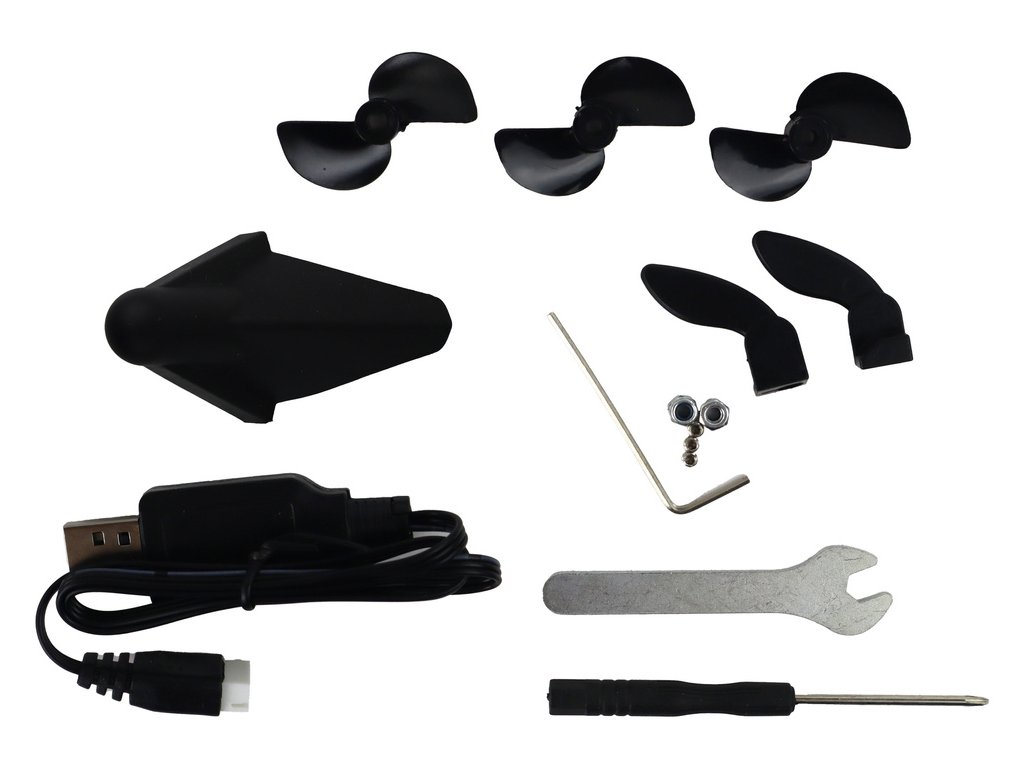 Súprava obsahuje aj príslušenstvo, ako napríklad kábel na batérie, stojan na motorový čln, ktorý ho udržuje stabilný na súši, dve vymeniteľné vrtule a dve vymeniteľné kormidlá.