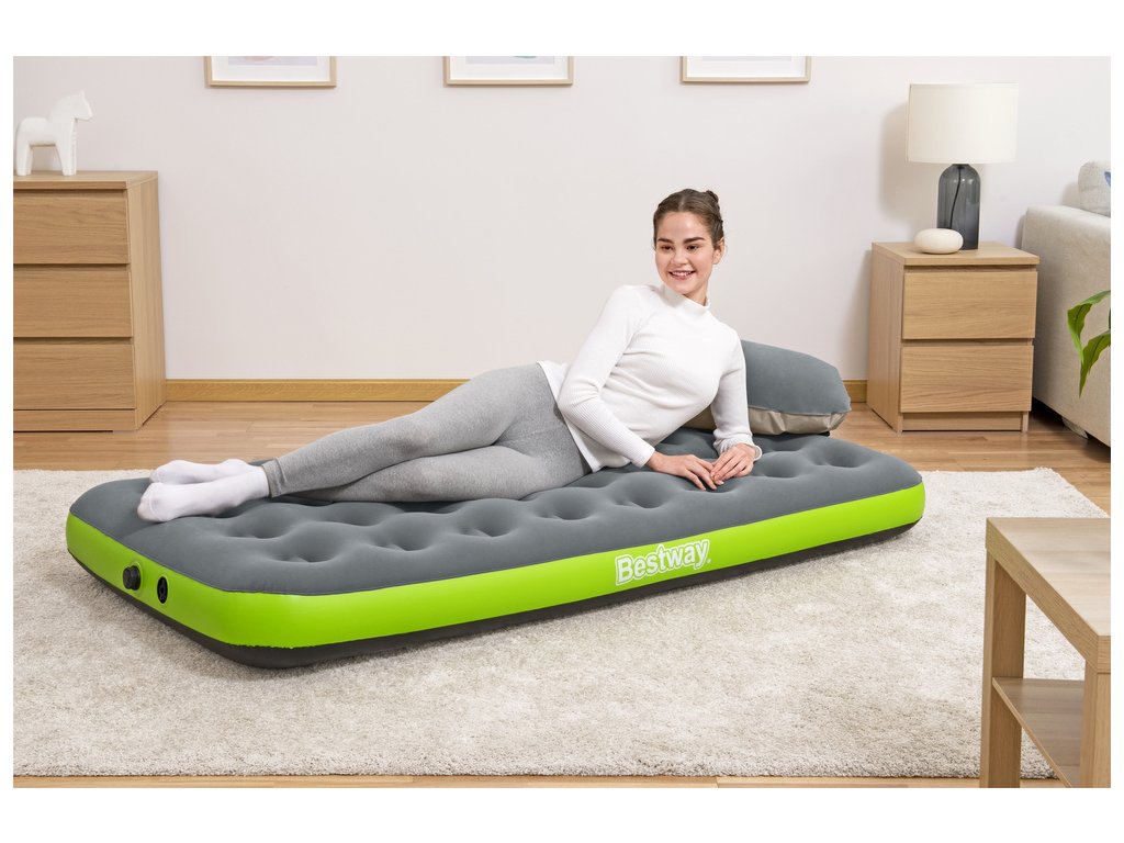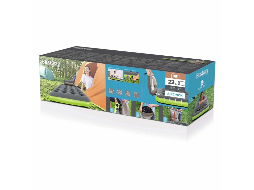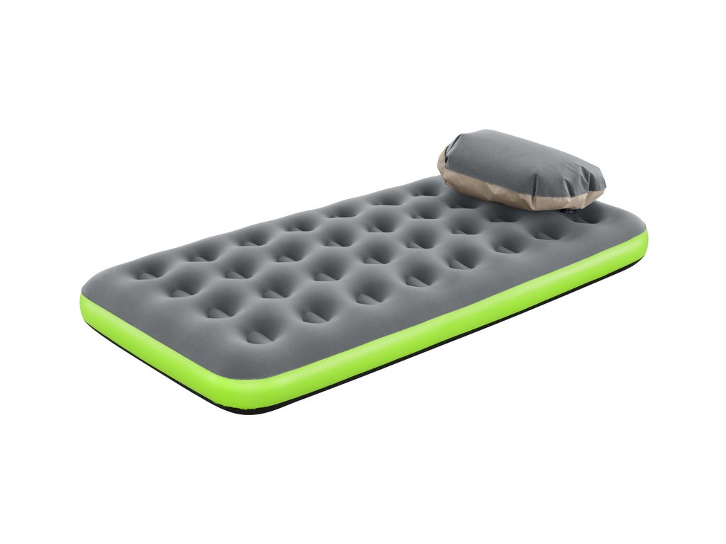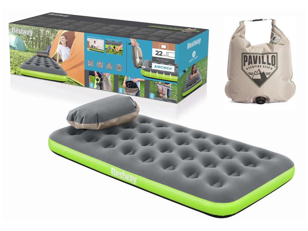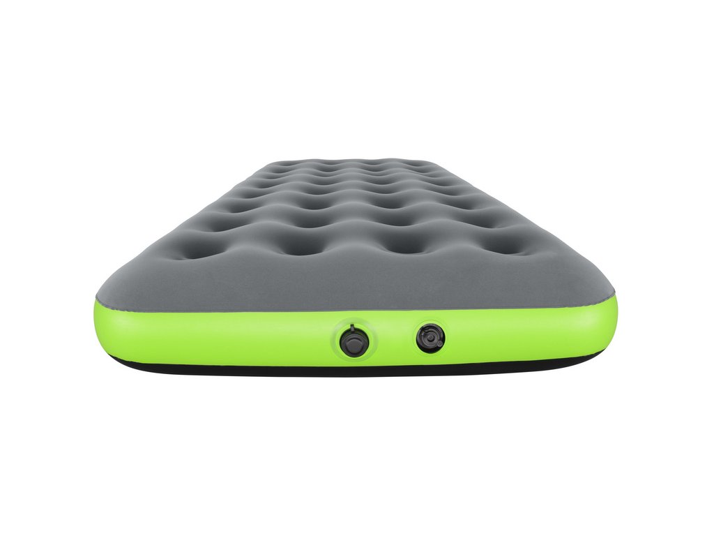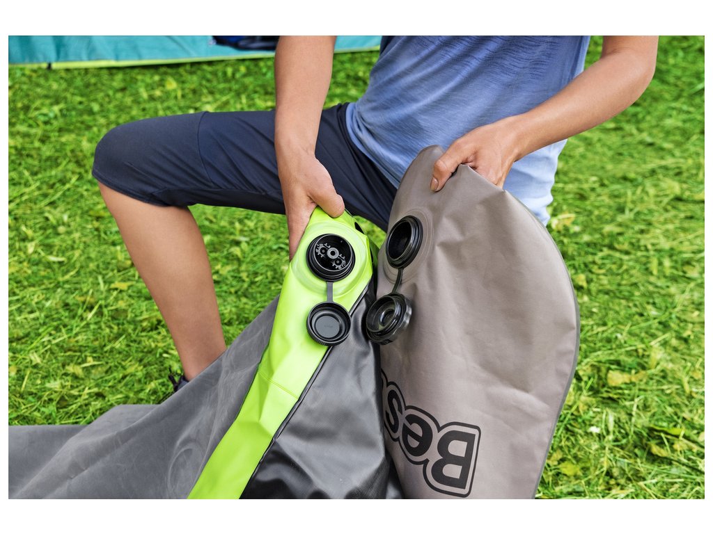 Tento cestovný matrac je určený na použitie v interiéri aj exteriéri. Je vyrobený z odolného PVC materiálu, vďaka čomu je odolný voči poškodeniu. Horná časť je pokrytá mäkkým velúrom. Matrac sa prispôsobuje telu a je ideálny na použitie v stane alebo doma ako náhradné lôžko pre hostí. Klasický nafukovací matrac má vinutú štruktúru, ktorá napodobňuje pružiny v bežnom matraci. Použitý materiál je robustný, čo zaručuje dlhú životnosť pre pohodlné kempovanie a outdoorové dobrodružstvá. Keď ste pripravení nafúknuť matrac, jednoducho ho vytiahnite a pripojte vak k ventilu. Otvorte vak a otáčajte ho hore a dole, aby sa naplnil vzduchom. Zrolujte otvorený koniec vaku, aby sa vzduch zachytil vo vnútri. Stlačte vak, aby sa vzduch dostal do matraca. Opakujte, kým matrac nedosiahne požadovanú tvrdosť. Matrac sa dá ľahko uložiť späť do prenosného vaku a pohodlne prenášať.