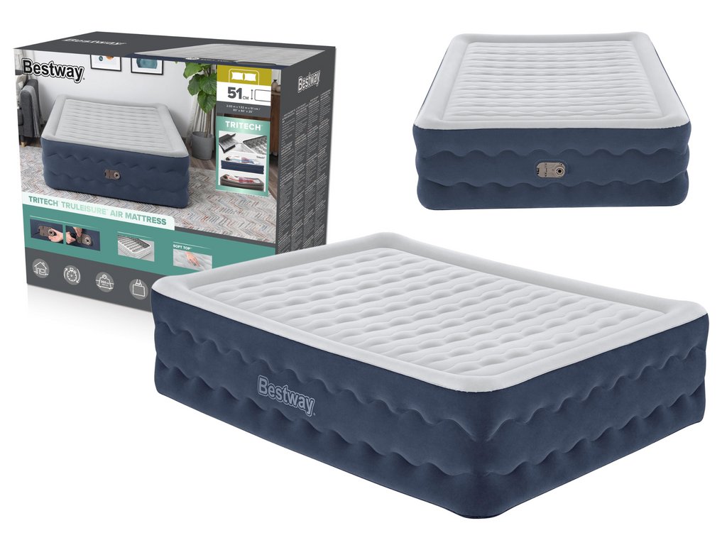 Dvojposteľová matrac Bestway je ideálnym riešením pre tých, ktorí ocenia pohodlie a odolnosť. Je ideálna ako náhradná posteľ pre hostí alebo prenosné miesto na spanie na cestách. Vďaka technológii Tritech™ je matrac odolný voči deformácii a zachováva si svoj tvar aj po opakovanom používaní. Vrchná vrstva matraca je pokrytá mäkkým flokovaným materiálom, vďaka čomu je spacie povrch príjemný a šetrný k pokožke. Okrem toho inovatívna vrstva ULTRA FRESH s antibakteriálnymi vlastnosťami chráni pred rastom baktérií a plesní, eliminuje nepríjemné zápachy a zaisťuje dlhotrvajúcu sviežosť.