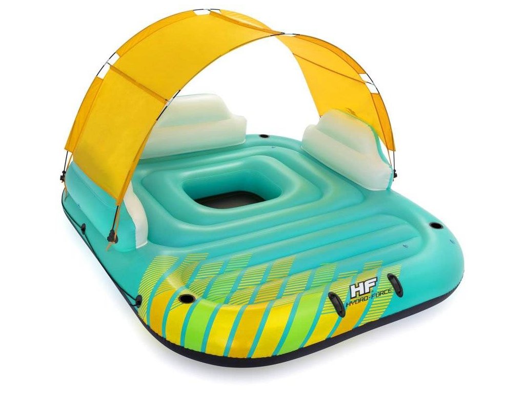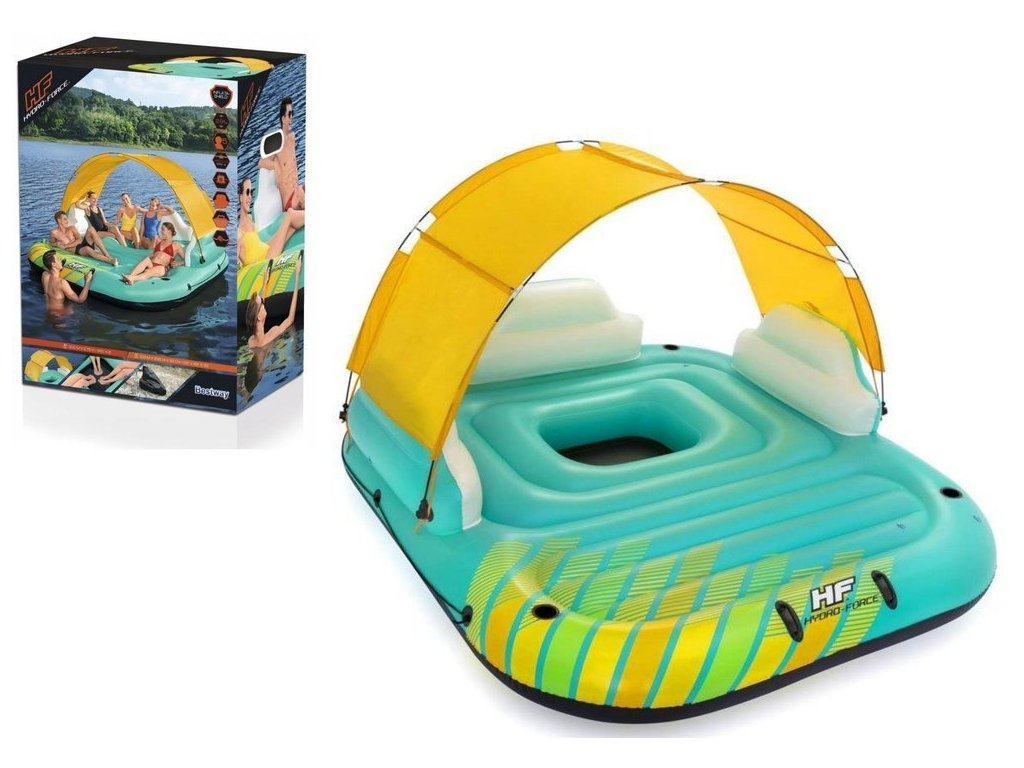 Systém zahrnutý v matraci zabezpečuje jej správnu pružnosť. Žltý baldachýn, ktorý chráni pred slnečnými lúčmi, sa dá ľahko odstrániť, aby sa eliminoval tieň, vďaka čomu je matrac ideálny na opaľovanie. Nafukovacie operadlá zabezpečujú pohodlie a držiaky na nápoje poskytujú rýchly prístup k vašim obľúbeným nápojom. Matrac obsahuje aj rukoväte a laná, ktoré uľahčujú jeho transport na breh. V strede matraca sa nachádza aj malý bazén na ochladenie nôh. Súčasťou sady je aj opravná záplata. Matrac je vyrobený z odolného vinylu.