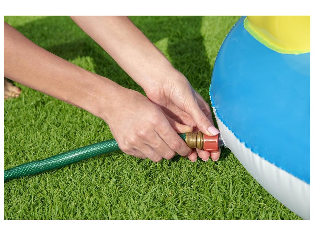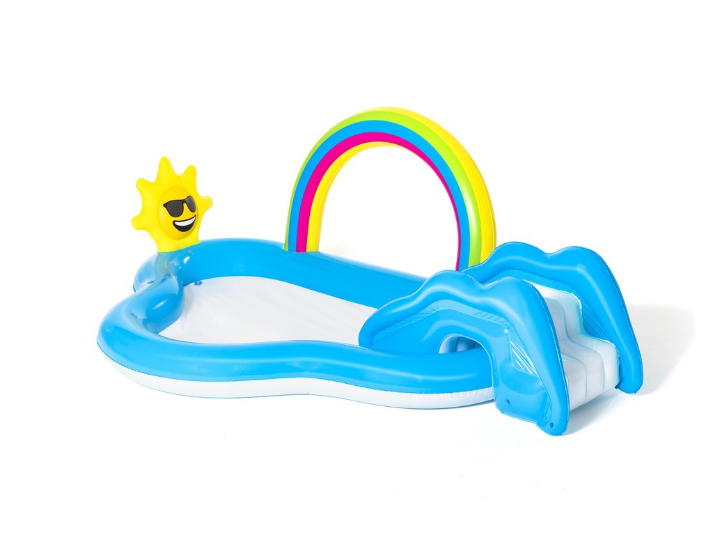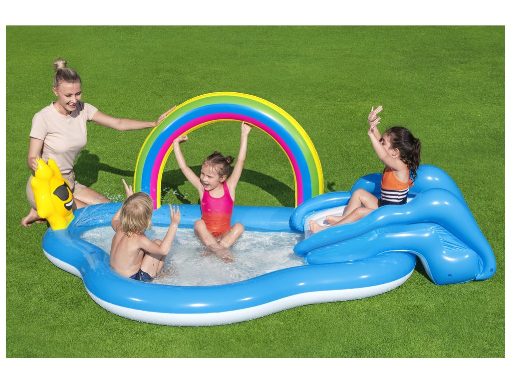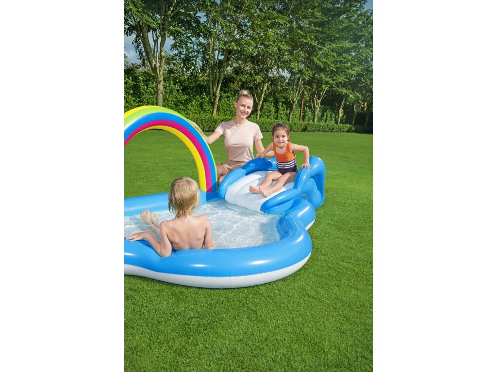 Chcete svojmu dieťaťu dopriať nezabudnuteľnú zábavu v pohodlí vašej vlastnej záhrady? Nafukovacie ihrisko ju premení na skutočné zábavné centrum pre vaše dieťa. Bazén s nafukovacími atrakciami, ako je nafukovacia šmýkačka a vodná fontána, určite poteší vaše dieťa a stane sa jeho obľúbeným miestom na hranie. Bazén je vyrobený z mäkkého, ale odolného materiálu a je úplne bezpečný pre najmenšie deti. Farebný bazén v tvare obláčika určite upúta pozornosť každého dieťaťa.
