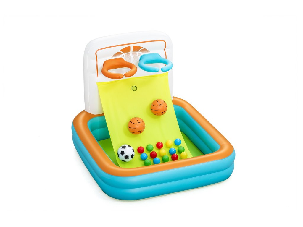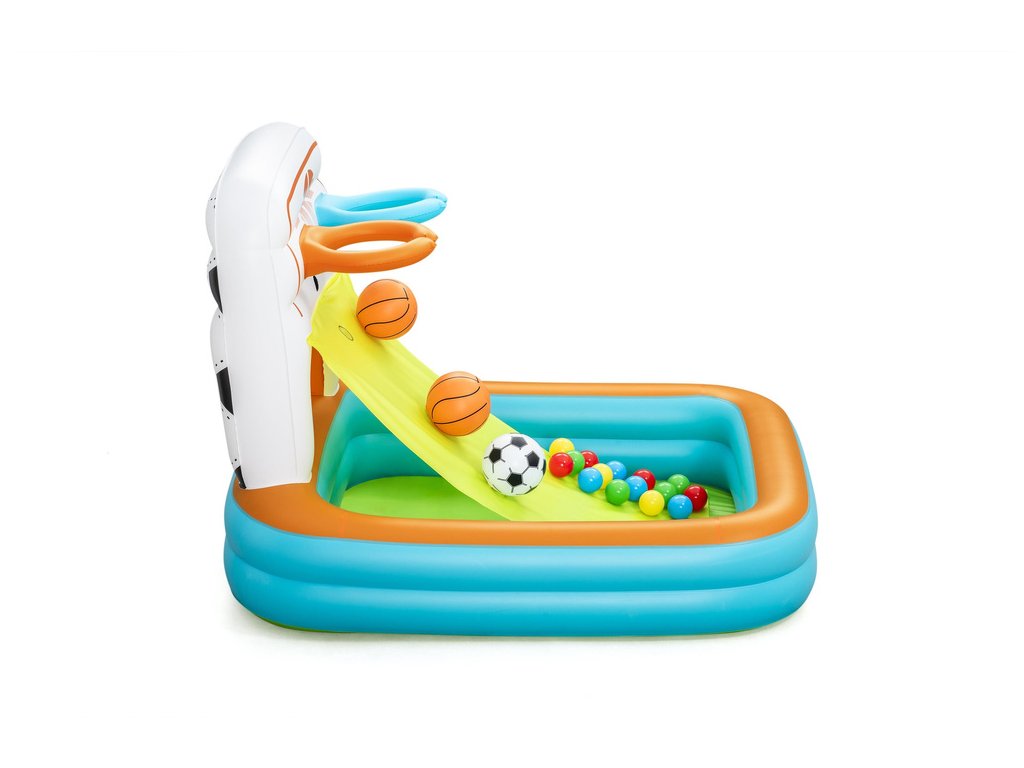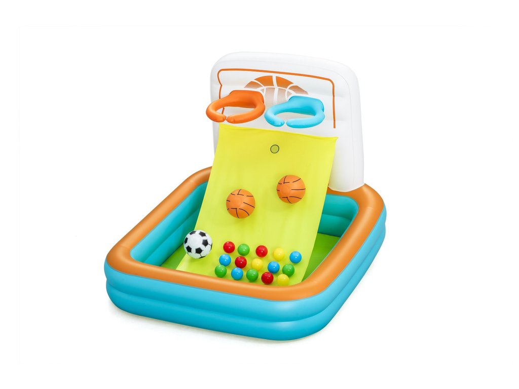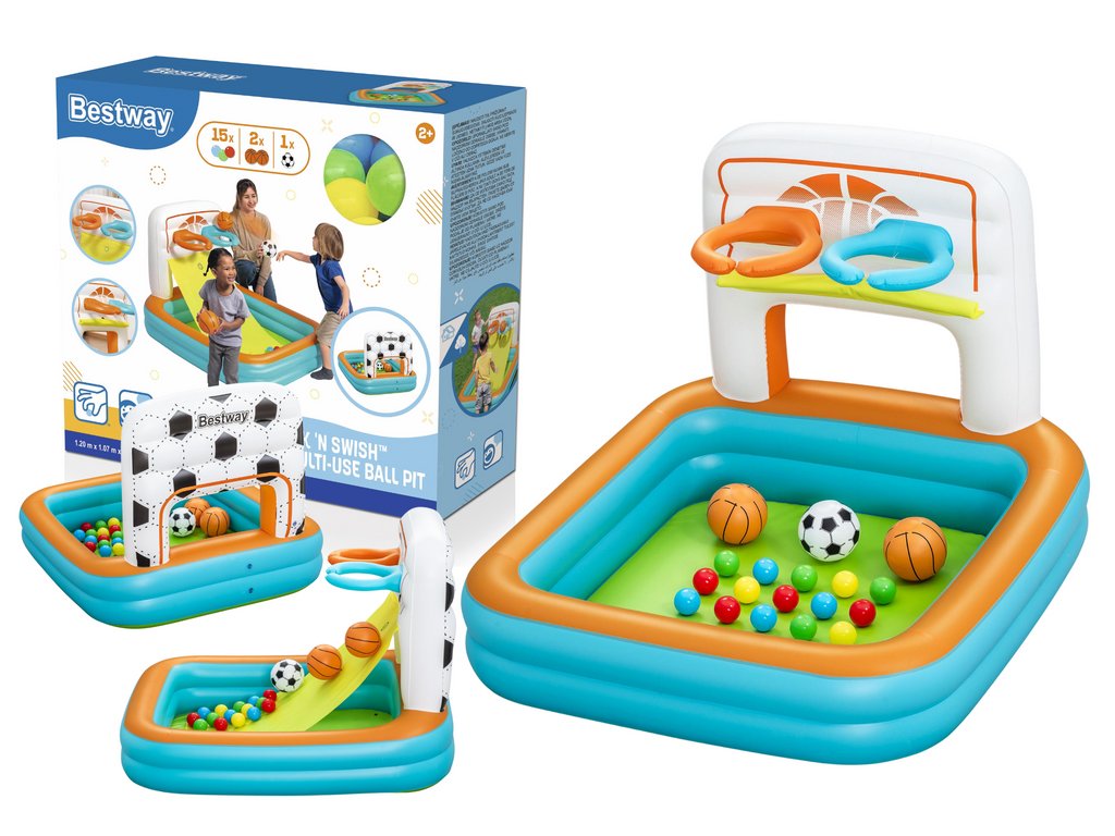 Multifunkčný nafukovací bazén 3 v 1 Bestway® Kick 'N Swish™ je ideálny pre aktívne hry detí. Súprava kombinuje tri atrakcie, ktoré poskytujú veľa zábavy a rozvíjajú motorické zručnosti. Na jednej strane sú dvojité basketbalové koše pre vzrušujúce súťaže v hádzaní voľných hodov a priložená vratná rampa zabezpečuje, že lopty sa automaticky vracajú k hráčom, čím je zaručená plynulá hra. Na druhej strane je mini bránka, ktorá deťom umožňuje trénovať presnosť streľby na futbal. Keď majú chuť na pokojnejšiu hru, stačí zložiť rampu, hodiť do bazénika 15 priložených loptičiek a premeniť súpravu na farebný bazénik s loptičkami, kde sa deti môžu ponoriť a relaxovať.