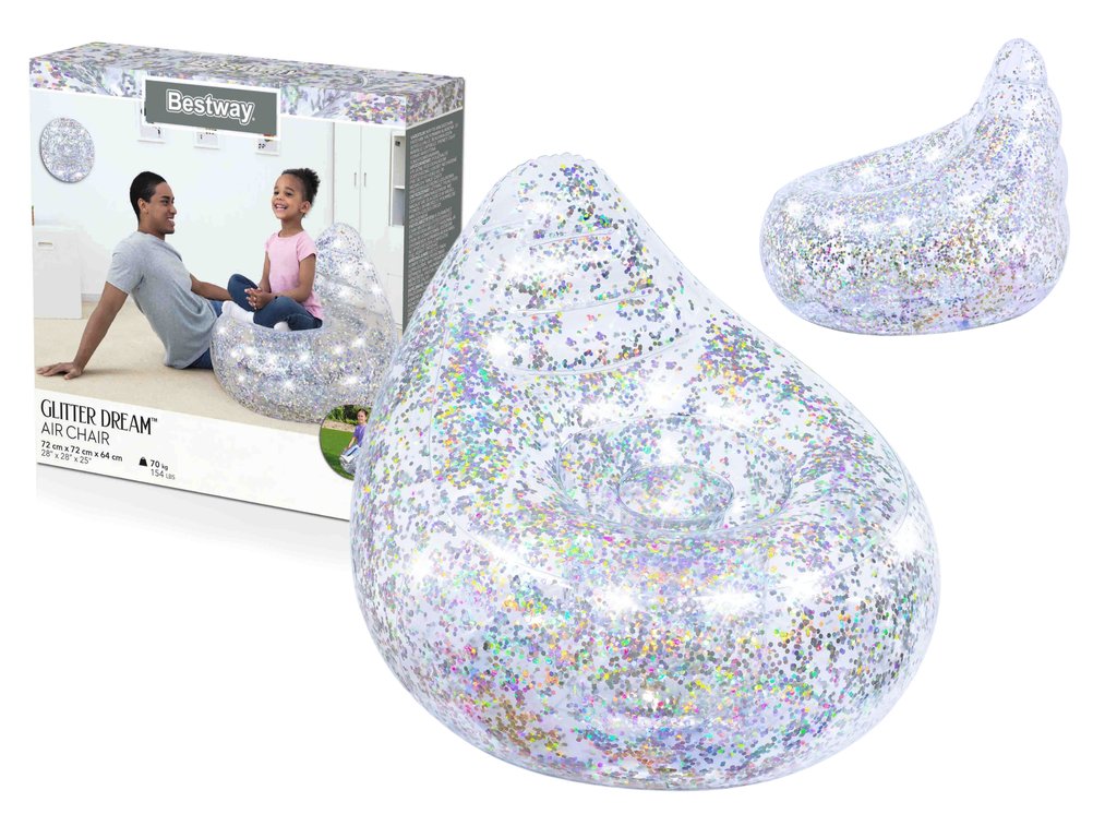 Nafukovacie kreslo sa ľahko rozloží, vyžaduje minimálny priestor na skladovanie a je mimoriadne pohodlné. Vďaka svojej pevnej konštrukcii a priestrannému povrchu je toto kreslo ideálne do detskej izby. Konštrukcia kresla zaručuje maximálny komfort, či už ležíte, natiahnete sa alebo sedíte vzpriamene. Kreslo je naplnené trblietkami, ktoré určite upútajú pozornosť tých najmenších. Okrem toho je ideálne pre použitie v interiéri aj exteriéri.