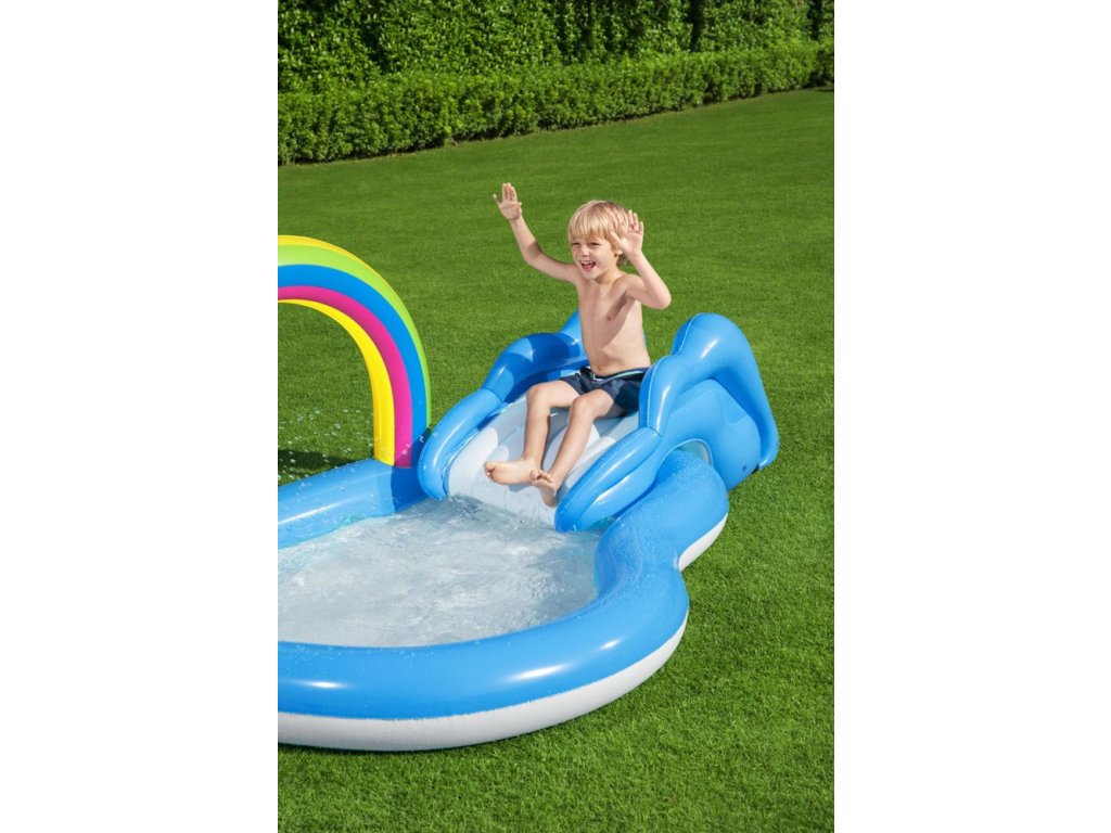 Chcete svojmu dieťaťu dopriať nezabudnuteľnú zábavu v pohodlí vašej vlastnej záhrady? Nafukovacie ihrisko ju premení na skutočné zábavné centrum pre vaše dieťa. Bazén s nafukovacími atrakciami, ako je nafukovacia šmýkačka a vodná fontána, určite poteší vaše dieťa a stane sa jeho obľúbeným miestom na hranie. Bazén je vyrobený z mäkkého, ale odolného materiálu a je úplne bezpečný pre najmenšie deti. Farebný bazén v tvare obláčika určite upúta pozornosť každého dieťaťa.