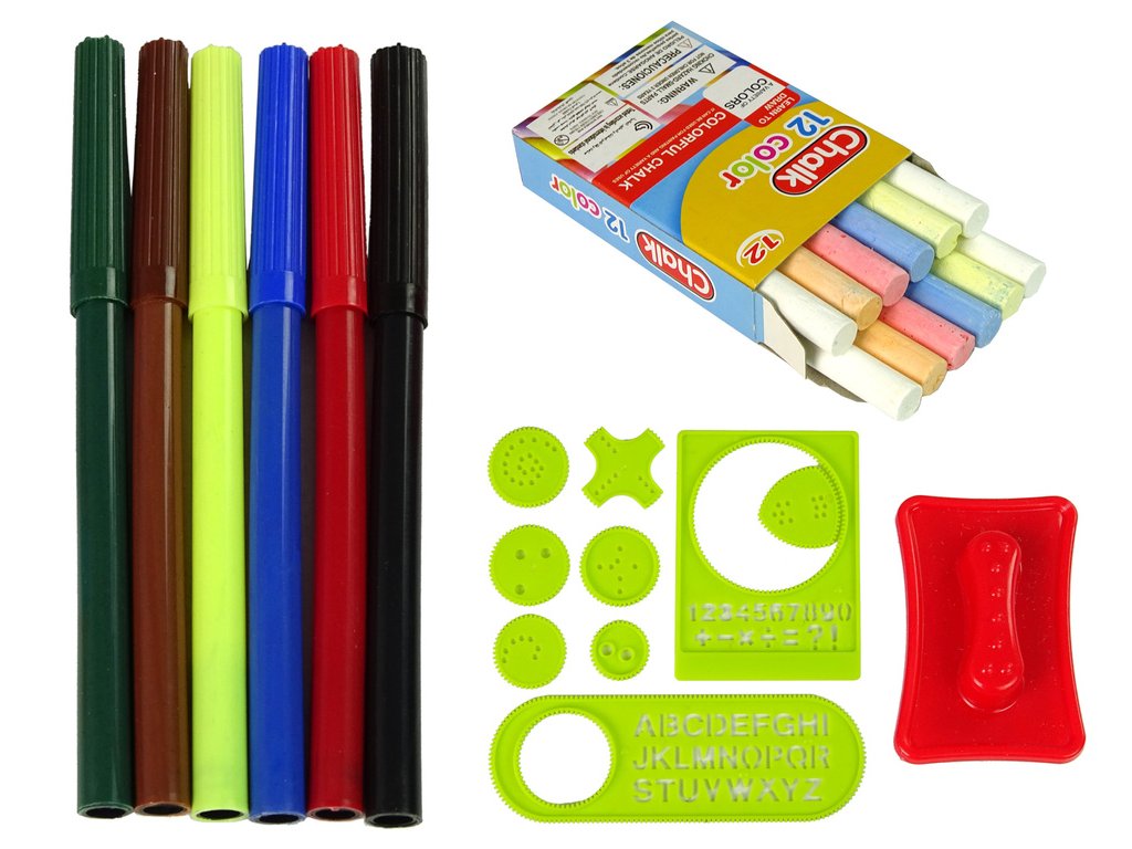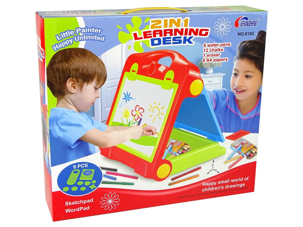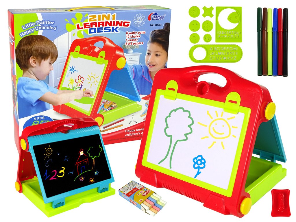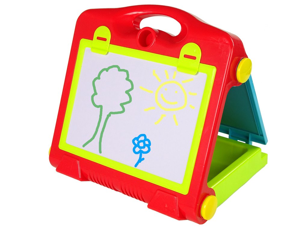 Táto nová, vzdelávacia, veľká tabuľa poteší každého malého fanúšika umenia. Na tabuľu môžete písať fixkami alebo kriedou a obkresľovať rôzne šablóny.