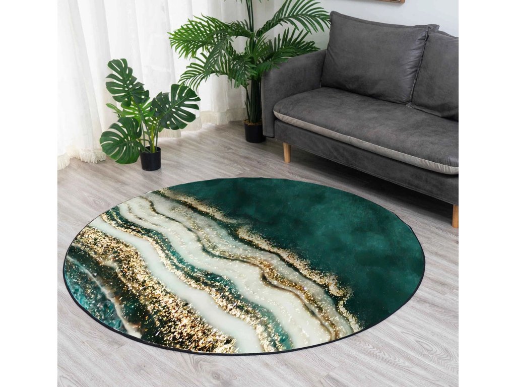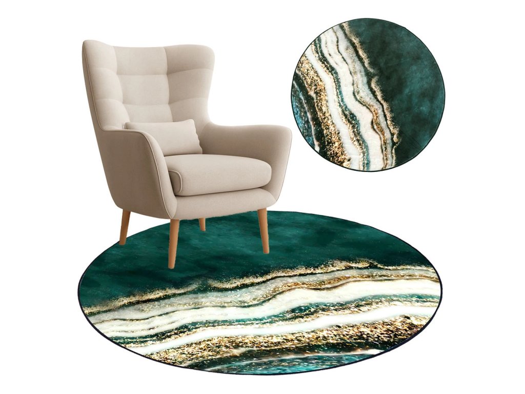 Okrúhly mramorový koberec Kiara prináša do interiéru elegantný, moderný a luxusný výraz vďaka atraktívnemu mramorovému vzoru s lesklými akcentmi. Kombinácia smaragdovo zelenej, bielej a zlatých detailov vytvára exkluzívny vizuálny efekt, ktorý okamžite rozžiari obývačku, spálňu, pracovňu či vstupnú halu. Koberec Kiara je dokonalou voľbou pre milovníkov glamour, moderného minimalizmu aj nadčasového elegantného štýlu.