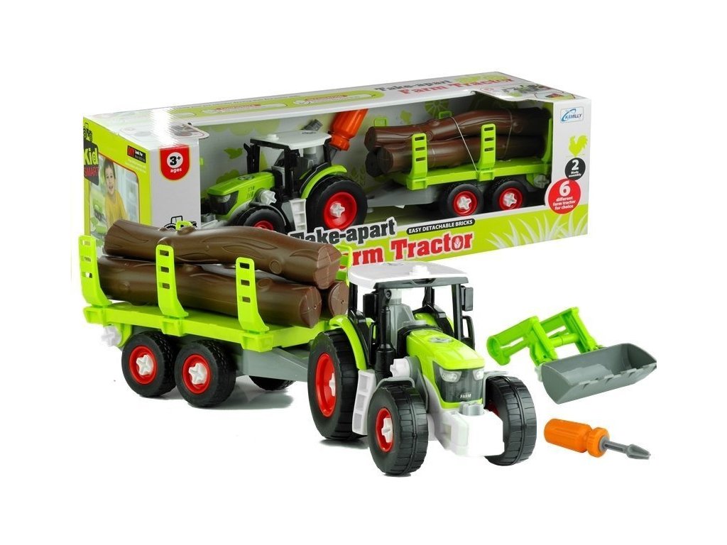 Súprava pre malých nadšencov DIY sa skladá zo skrutkovača, skrutiek, traktora, prívesu, dreva a bagrovacieho ramena. Celá súprava je vyrobená z plastu, čo zaručuje dlhú životnosť hračky. Traktor a príves sú namontované na plastových kolieskach s dezénom, ktoré sa otáčajú. Farebné prevedenie hračky je veľmi príjemné na pohľad, kombinácia zelenej a čiernej farby s sivými a červenými detailmi vyzerá fenomenálne.