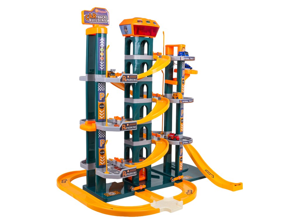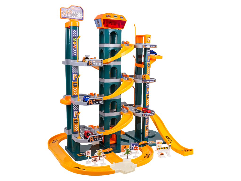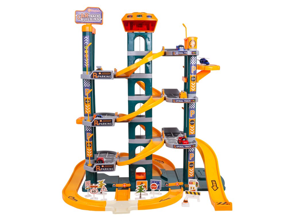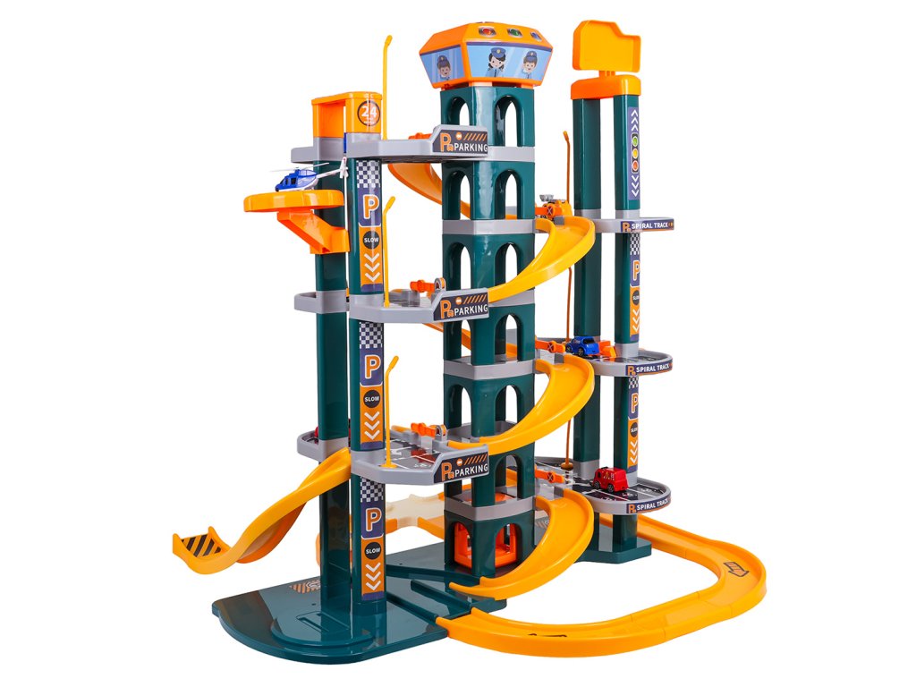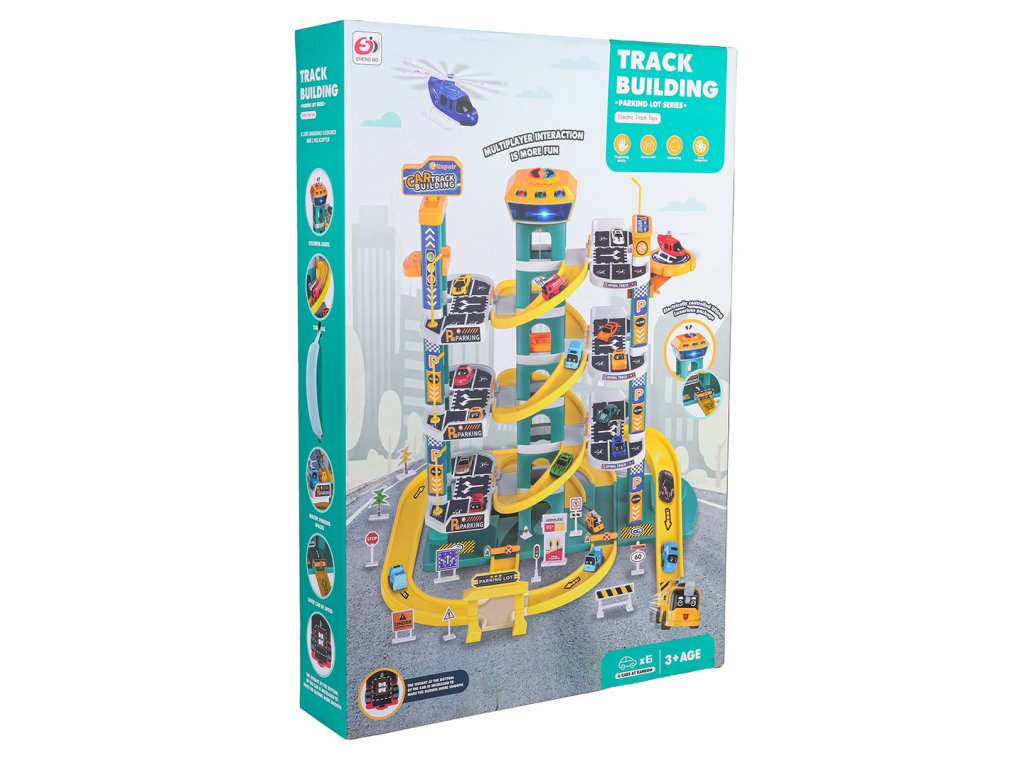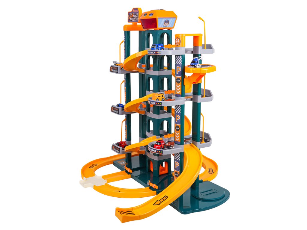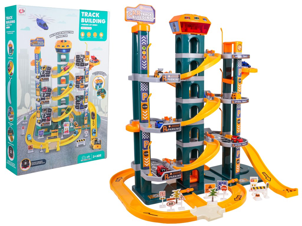 Skvele vyrobené parkovisko so zvukovými a svetelnými efektmi pre deti od troch rokov. Sada je vyrobená z najkvalitnejších materiálov, ktoré sú bezpečné pre deti, a je k dispozícii v žiarivých farbách. Parkovisko má štyri poschodia s parkovacími miestami. K nim sa dostanete pomocou elektrického výťahu napájaného tromi 1,5 V AA batériami (nie sú súčasťou balenia). V hornej časti výťahu sa nachádza panel, ktorý slúži na pohyb hore a dole, ako aj na zvukové efekty v podobe veselých melódií, zvukov vozidiel, sirén a svetelných efektov, ako sú blikajúce tlačidlá vstupu a výstupu. Autá môžu zhora zostupovať výťahom alebo šmýkačkou. Sada obsahuje šesť áut a vrtuľník. Nechýbajú ani početné semafory, dopravné značky, stromy a zábrany.