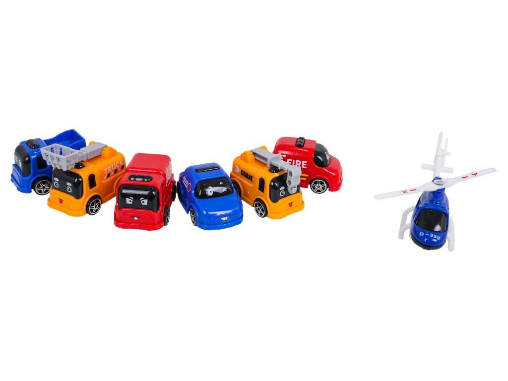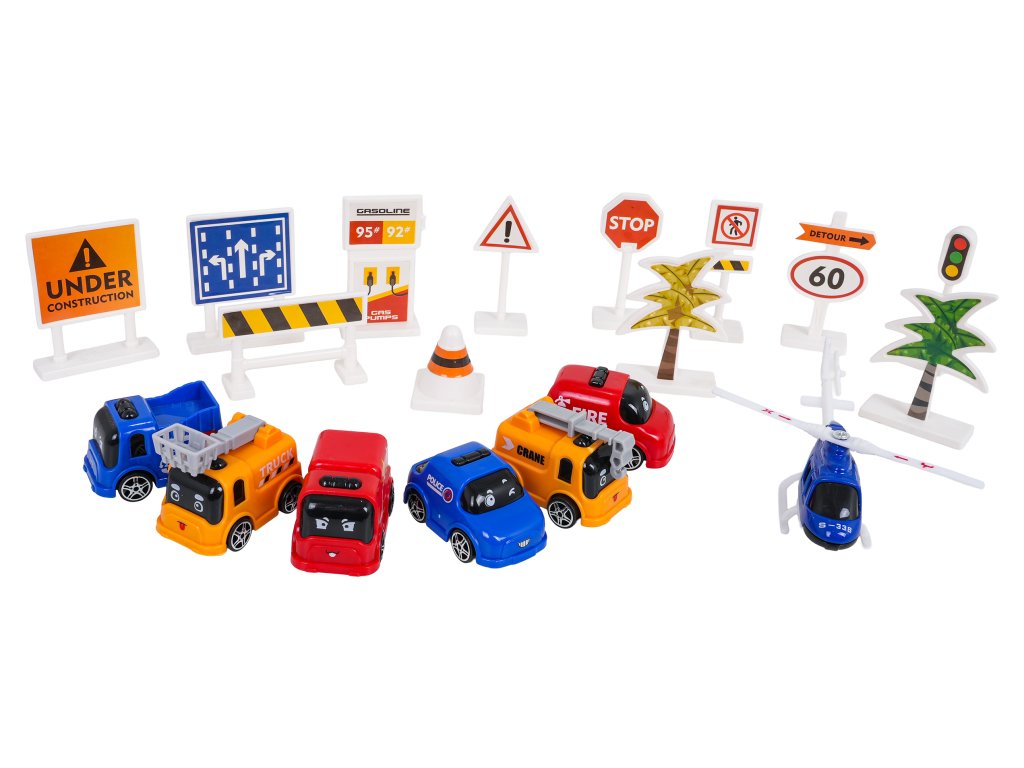 - stavebné diely, - ozdobné nálepky, - montážny návod, - 6 x vozidlá (2 x žeriav, 2 x hasiči, polícia, cestná asistencia + vrtuľník) |