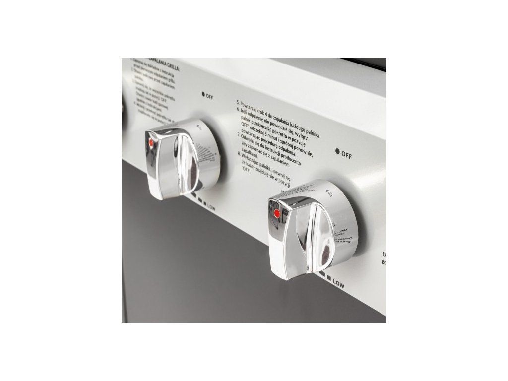 Model je vybavený bočnými policami a uzamykateľnou skrinkou s dvierkami, ktorá umožňuje uloženie grilovacieho príslušenstva. Ovládací panel s označením v poľskom jazyku umožňuje pohodlné ovládanie horákov.