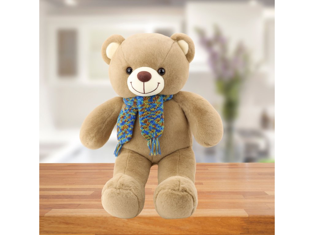 Plyšový maskot objímateľný medvedík Farebná vlnená šatka hnedá 55cm
