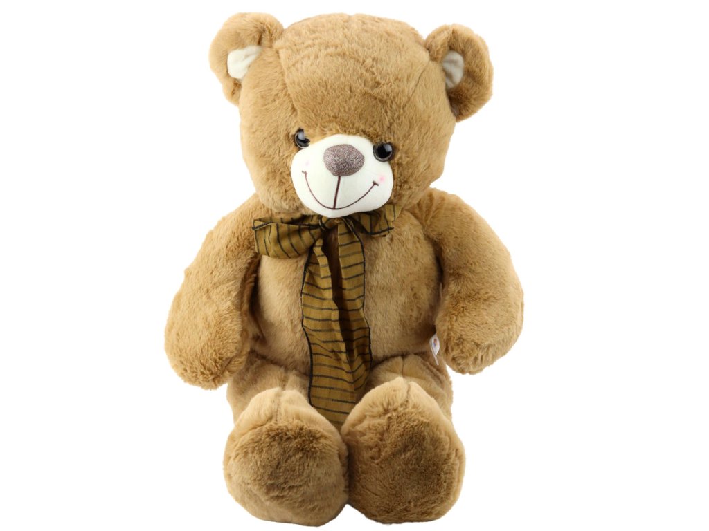 Tento veľký medvedík s mašľou je klasická maskota, ktorá spája čaro tradičnej hračky s moderným remeselným spracovaním. Je vyrobený z mimoriadne mäkkého, svetlohnedého plyšu, je veľmi príjemný na dotyk a ideálny na maznanie. Jeho veselý výraz, zaoblené tvary a kontrastná, dekoratívna pruhovaná mašľa robia z medvedíka potešenie pre deti i dospelých.