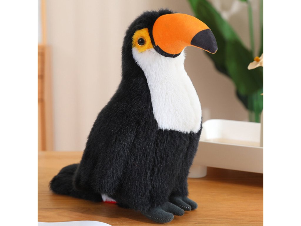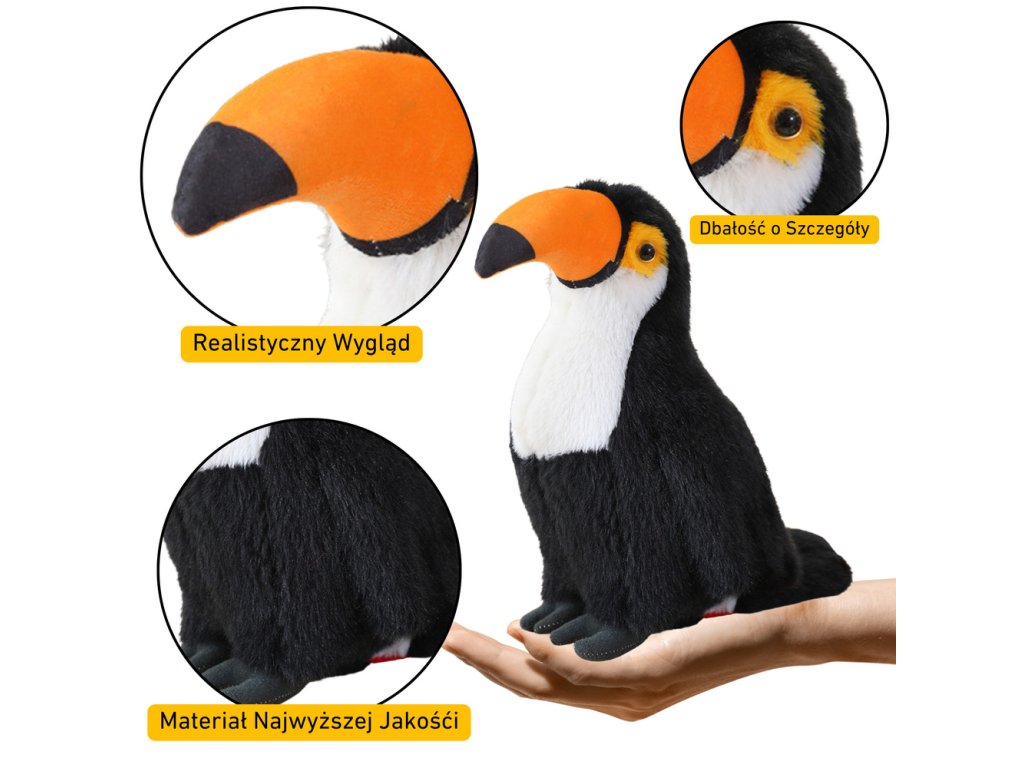 Predstavujeme 35 cm vysokú plyšovú maskota tukan, verne reprodukujúcu charakteristické čierno-biele operenie s jasnými akcentmi tohto exotického vtáka. Vyrobená z mimoriadne mäkkého a príjemného na dotyk materiálu, poskytuje výnimočný komfort pri maznaní. Starostlivo vypracované detaily mu dodávajú autentický vzhľad, vďaka čomu je ideálnym spoločníkom na hranie a dekoráciou detskej izby.