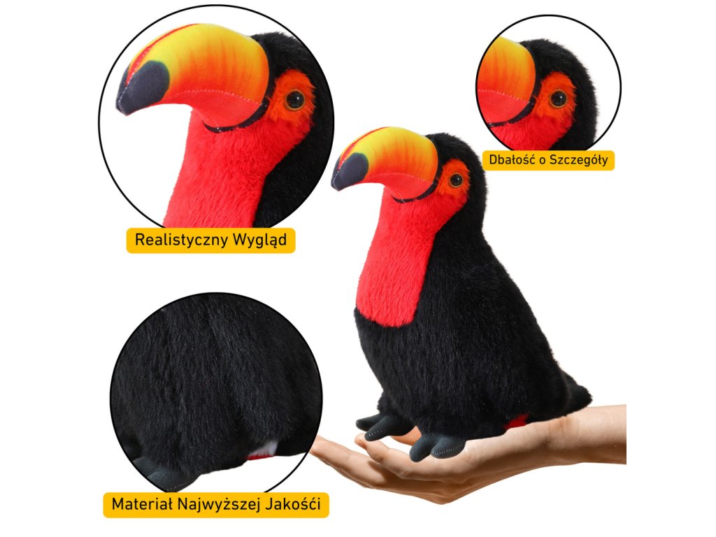 35 cm vysoká plyšová maskota tukan, verne reprodukujúca charakteristické čierne operenie s červenými akcentmi. Vyrobená z mimoriadne mäkkého a príjemného materiálu, poskytuje výnimočný komfort pri maznaní. Starostlivo prepracované detaily jej dodávajú autentický vzhľad, vďaka čomu je ideálnym spoločníkom na hranie a dekoráciou detskej izby.