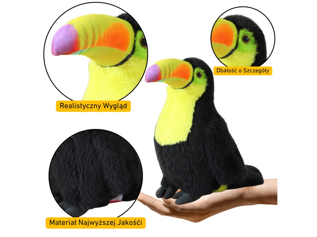 Predstavujeme 35 cm vysokú plyšovú maskota tukan, verne reprodukujúcu charakteristické čierne operenie s jasne žltými akcentmi. Vyrobená z mimoriadne mäkkého a príjemného na dotyk materiálu, poskytuje výnimočný komfort pri maznaní. Starostlivo vypracované detaily jej dodávajú autentický vzhľad, vďaka čomu je ideálnym spoločníkom na hranie a dekoráciou detskej izby.