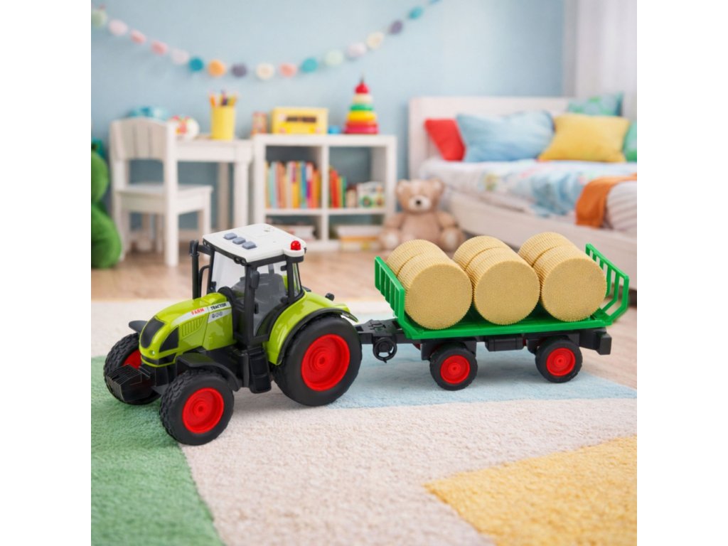 Odnímateľný príves umožňuje prepravovať šesť balíkov sena, ktoré je možné vybrať a použiť na vytvorenie vlastnej trasy hry. Pogumované kolesá s dezénom zaisťujú stabilitu pri jazde a otočné prvky uľahčujú manévrovanie s vozidlom. Vo vnútri kabíny pokrytej sklom sa nachádza sedadlo vodiča, volant a ovládací panel, vďaka čomu si vaše dieťa môže zahrať na skutočného farmára.