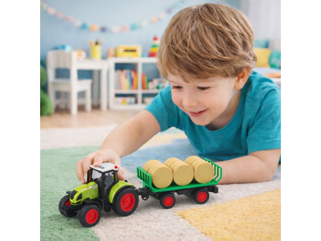 Zelený traktor s prívesom a balíkmi sena je realistická hračka určená pre deti, ktoré fascinujú poľnohospodárske stroje a práca na farme. Model bol navrhnutý s veľkým dôrazom na detaily a verne reprodukuje skutočný traktor používaný na farmách. Hračka nielenže upúta pozornosť svojím vzhľadom, ale ponúka aj mnoho funkcií, ktoré robia hru ešte zaujímavejšou a pestrejšou.